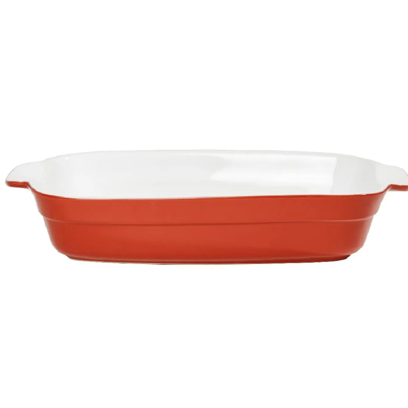 Plat à four rectangulaire intérieur blanc et extérieur rouge avec poignées.