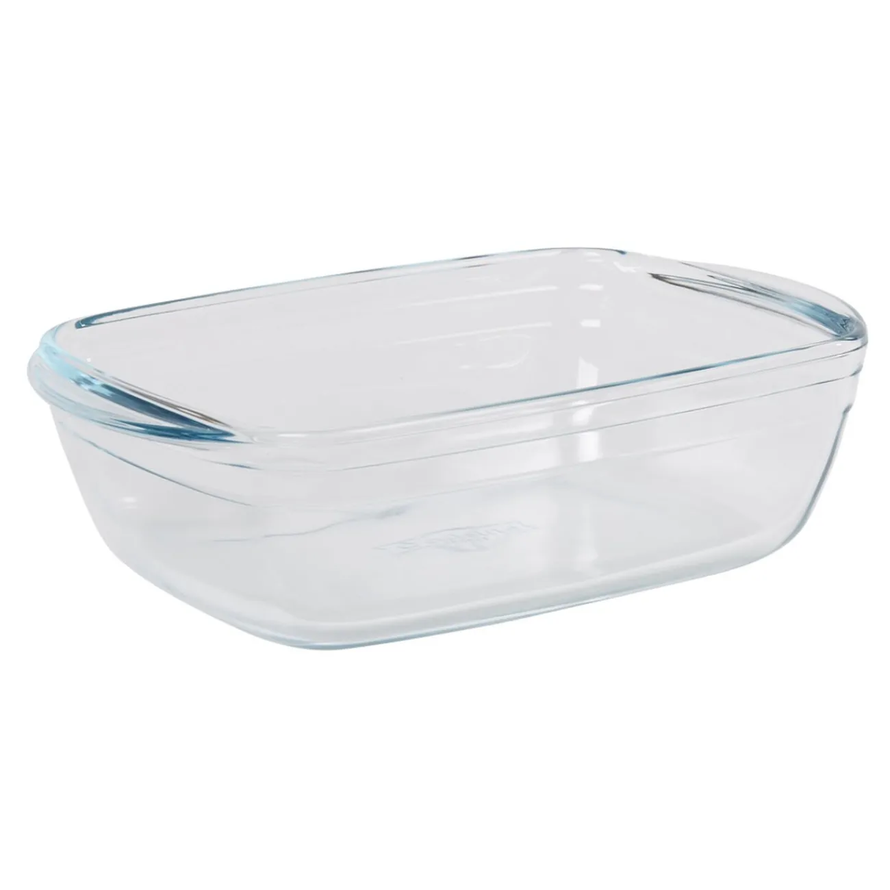 Plat à four rectangulaire en verre transparent avec couvercle plastique.