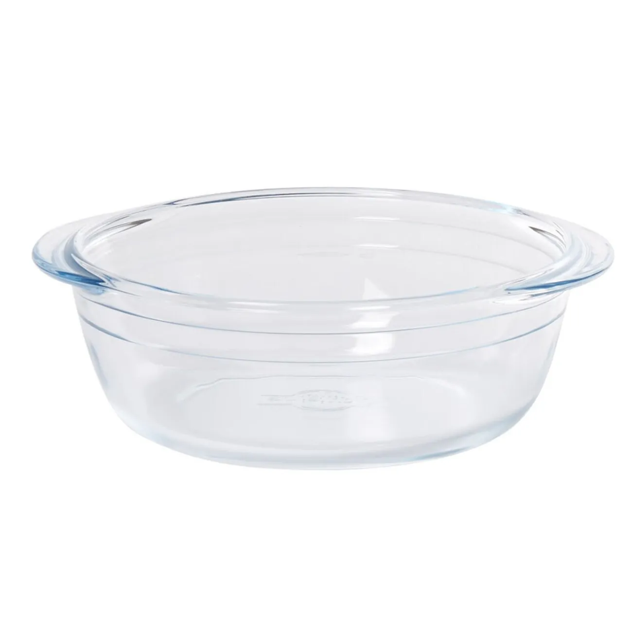 Plat à four rond en verre transparent avec couvercle en plastique rouge.