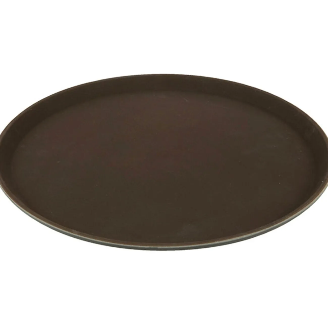 Plateau antidérapant rond, couleur chocolat, Ø 35 cm, fibre de verre. Sa feuille de caoutchouc antidérapante recouvre tout le plateau pour assurer un maximum d’efficacité. Modèle phare utilisé en restauration !