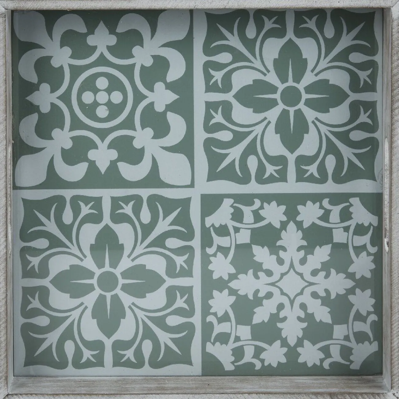 Plateau en bois naturel avec décor carreaux de ciment dans les tons blanc et vert d’eau. Deux anses sont prévues pour porter simplement ce joli plateau de service.