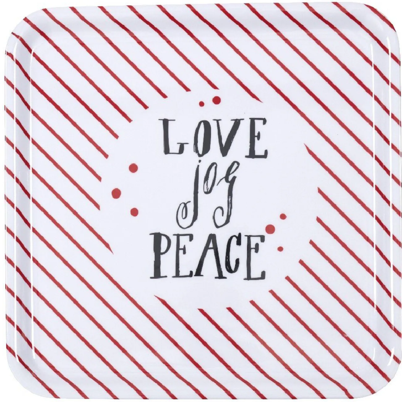 Plateau de forme carré blanc avec rayures diagonales rouges et inscription « Love Jog Peace ». Dans la même gamme, vous trouverez le mug classique assorti sous la référence 539470, tapez la directement dans notre moteur de recherche.