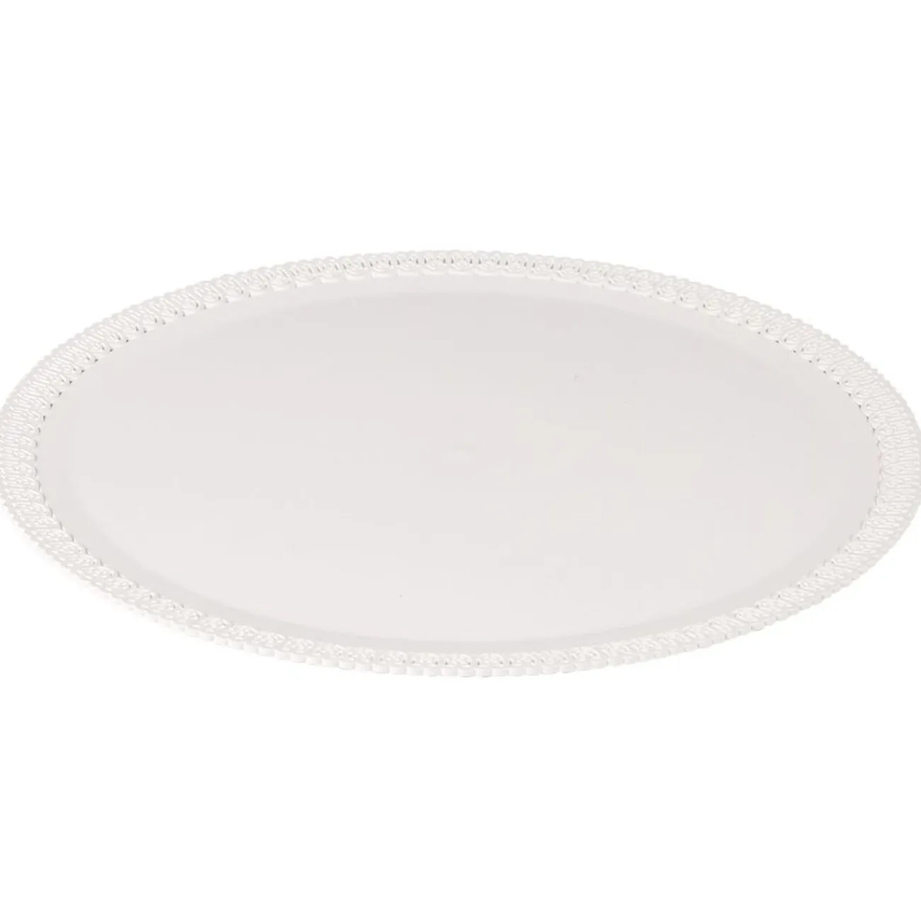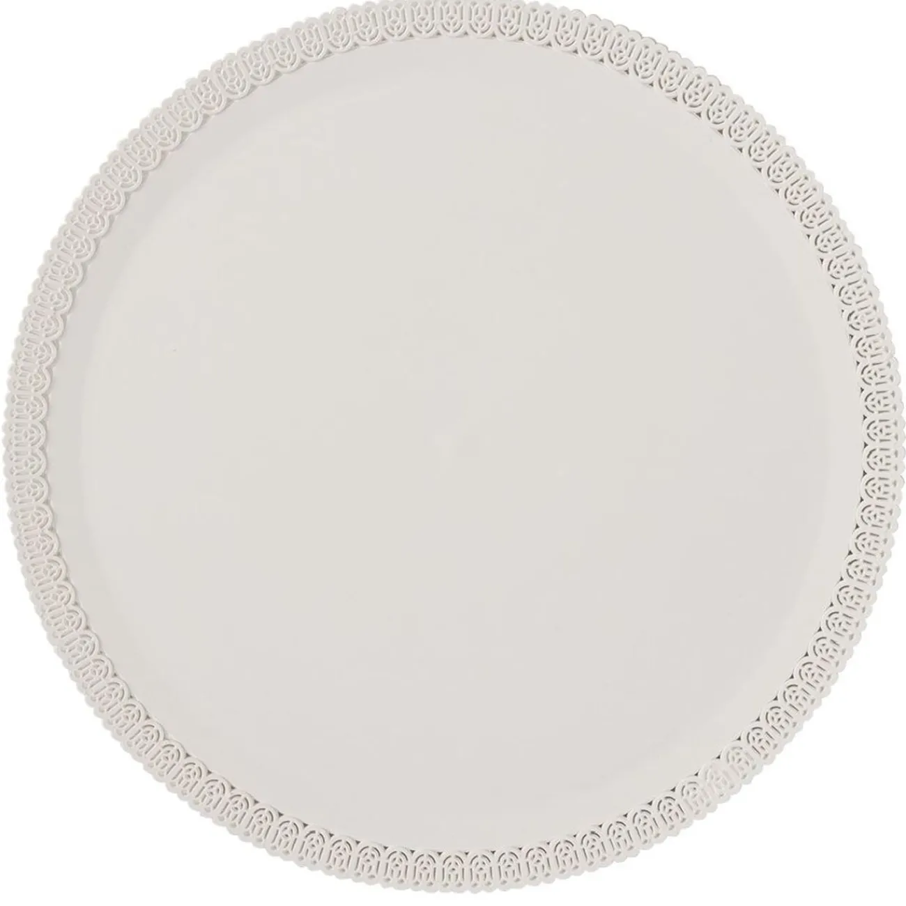 Plateau de présentation pour gâteau rond en plastique blanc avec joli décor en relief sur tout le contour.