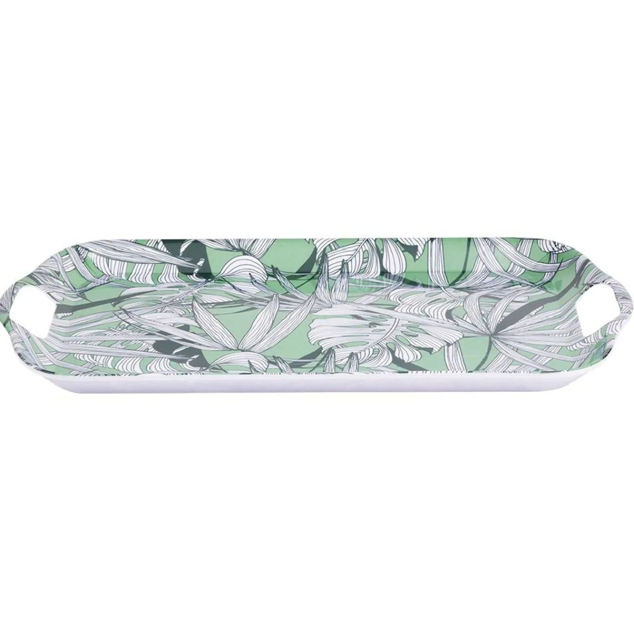 Plateau en plastique mélaminé imprimé feuillage exotique vert.
