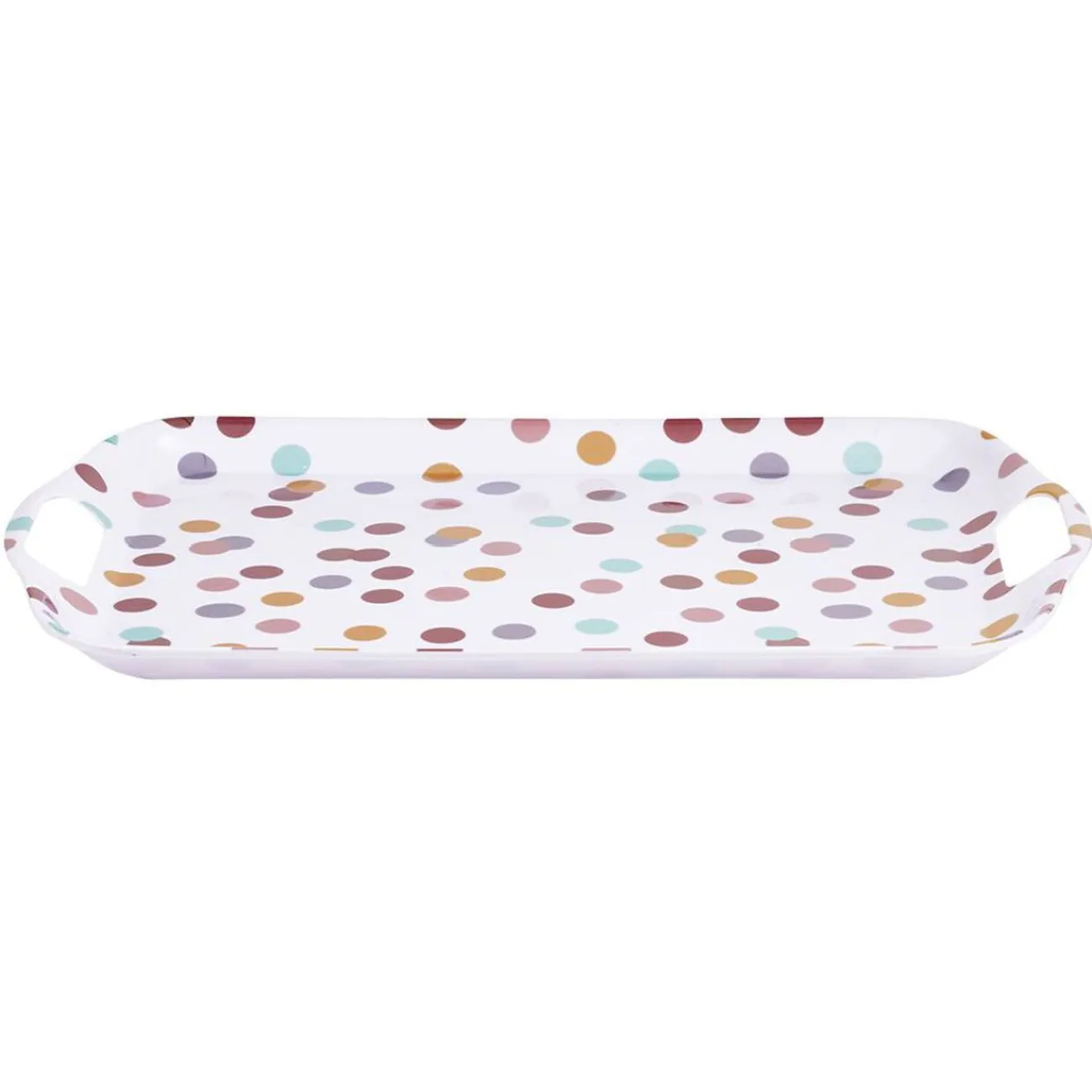 Plateau en plastique mélaminé imprimé pois multicolores.
