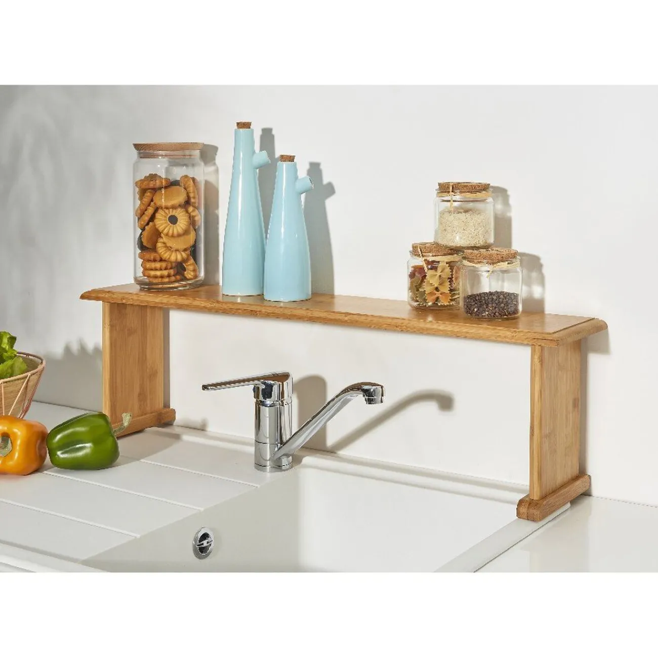 Pont de rangement en bois pour évier.