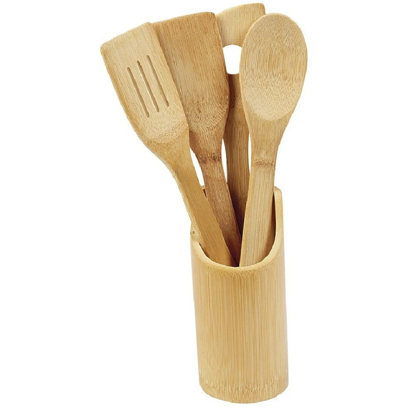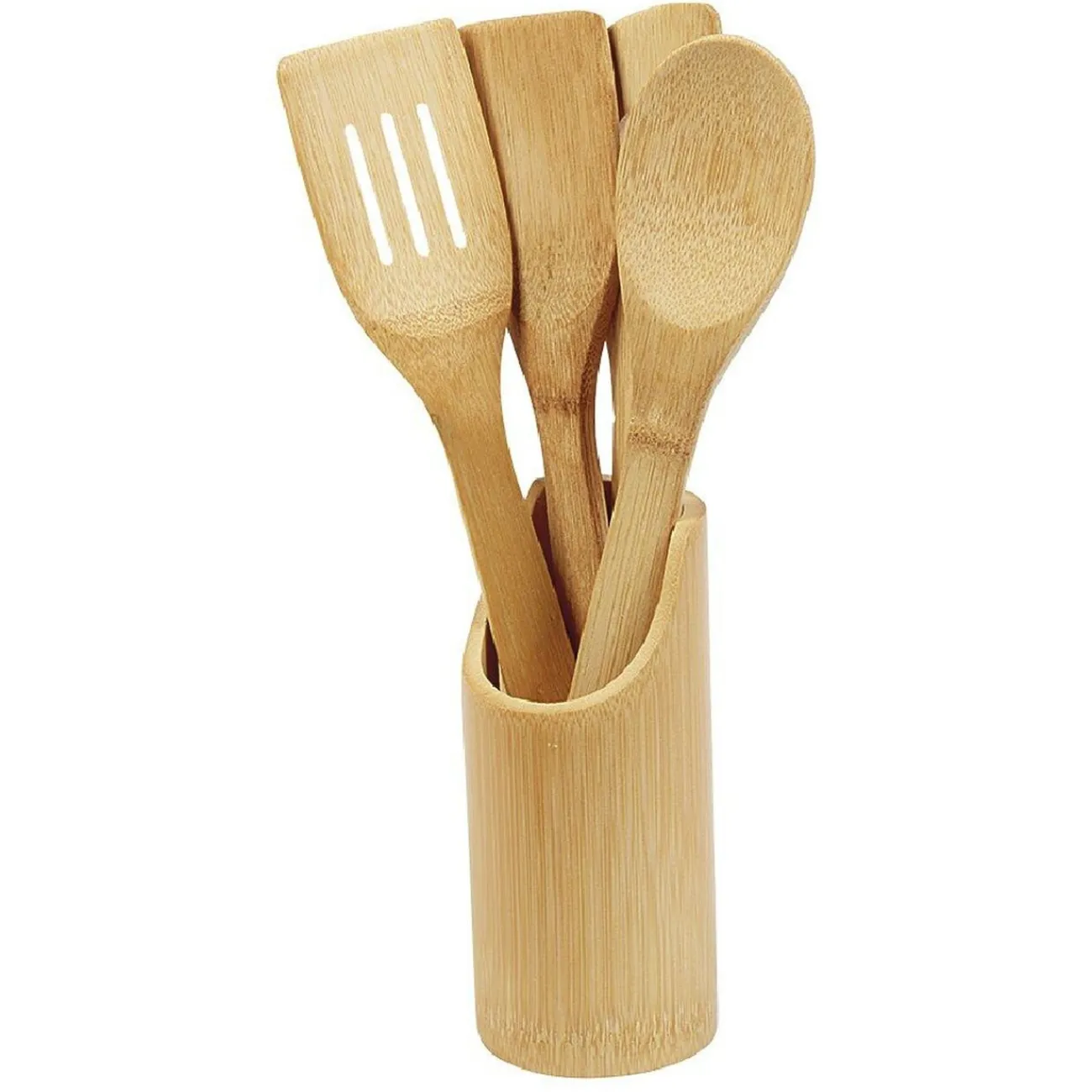 Set de 4 ustensiles de cuisine et pot assorti entièrement conçu en bambou naturel.