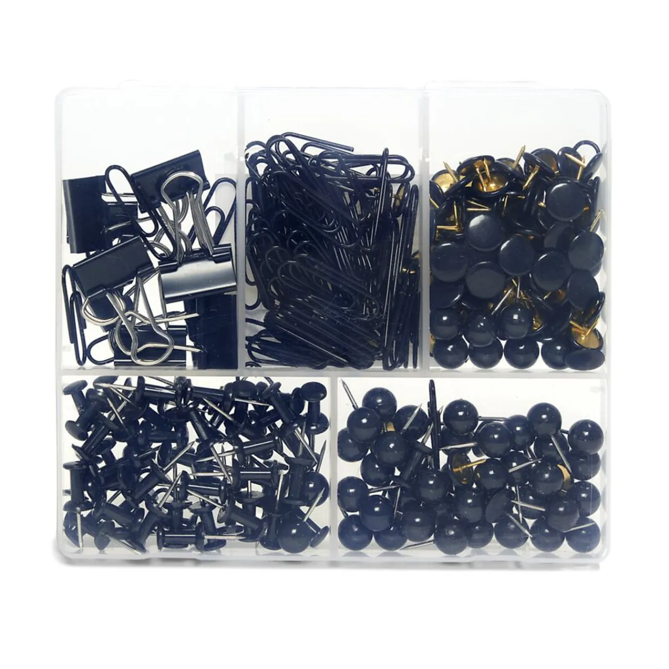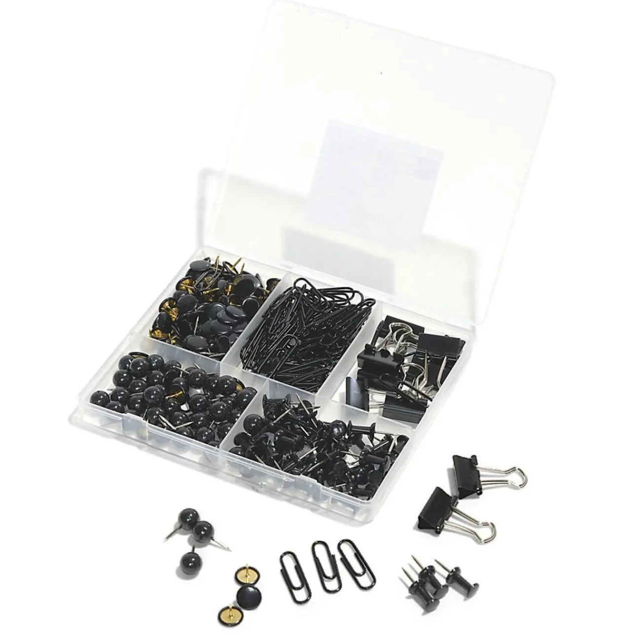 Elle comprend des attaches parisiennes, des trombones, des pinces double-clip, des punaises sphériques et des punaises plates.