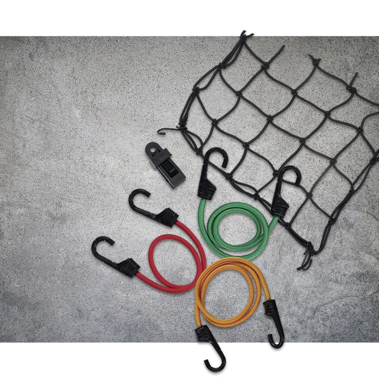 Set d’arrimage 29 pièces, assortiment complet de tendeurs, crochets, clips et filet de maintien :