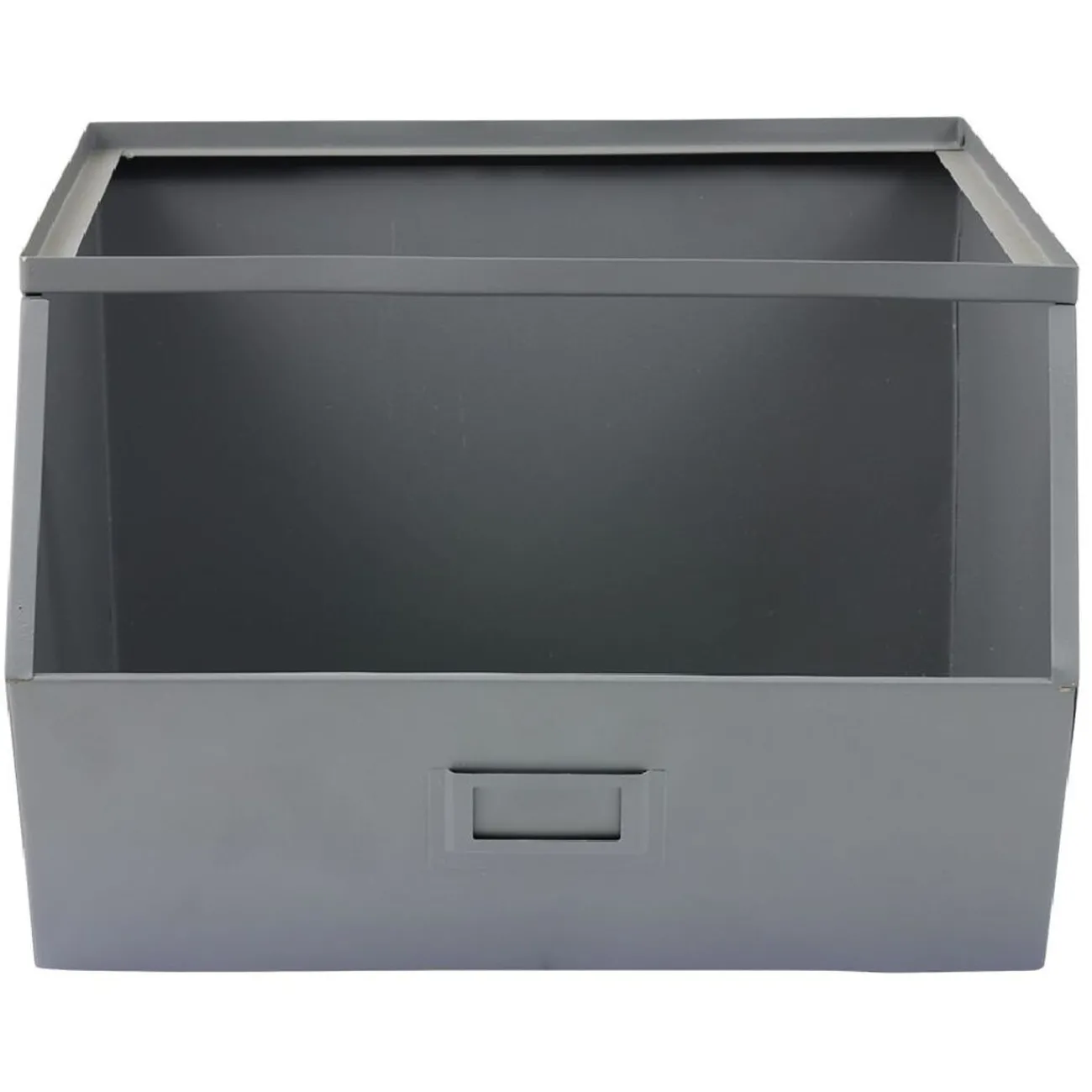 Bac de rangement superposable en métal gris, idéal pour organiser votre intérieur dans un esprit rétro.