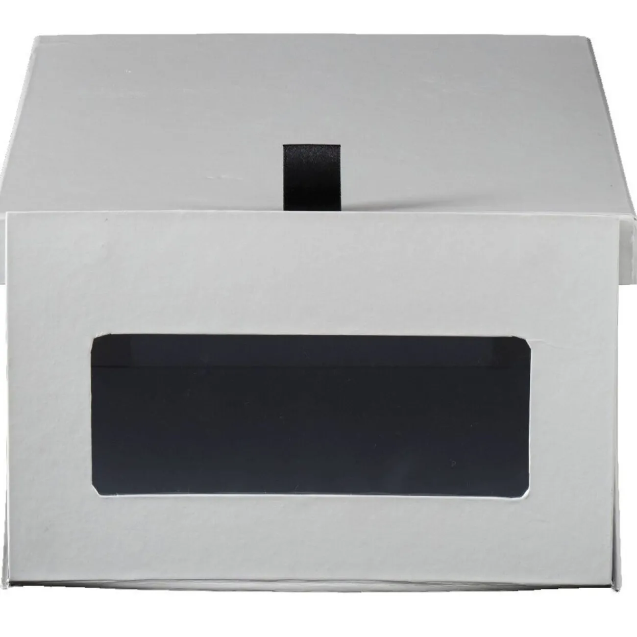 Boîte à chaussures blanche avec fenêtre transparente et fermeture aimantée.