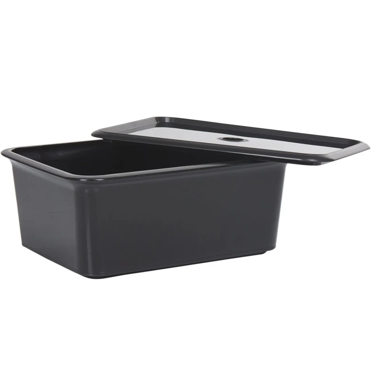 Boîte de rangement noire avec couvercle.