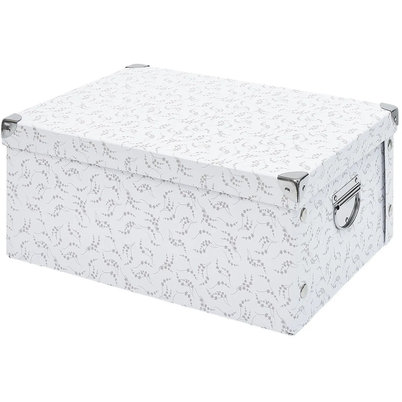 Boîte de rangement en carton avec renfort en métal sur les coins. Pratique pour rassembler vos dossiers et petits accessoires dans les placards ou sur les étagères.