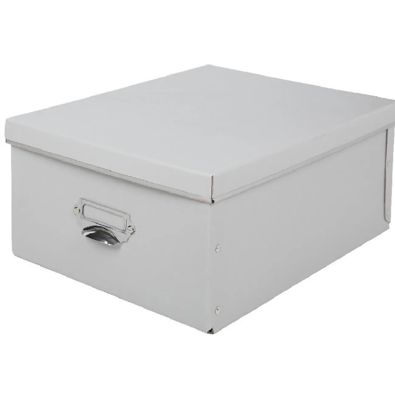 Boîte de rangement en carton gris clair avec couvercle et poignée.