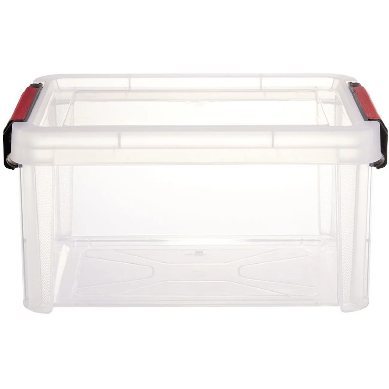 Boîte de rangement en plastique transparent avec couvercle à fermeture par clips rouges. Idéal pour garder vos fournitures de bureau à l’abri de la poussière et parfaitement rangés.