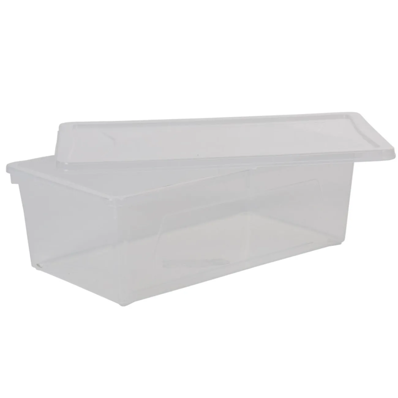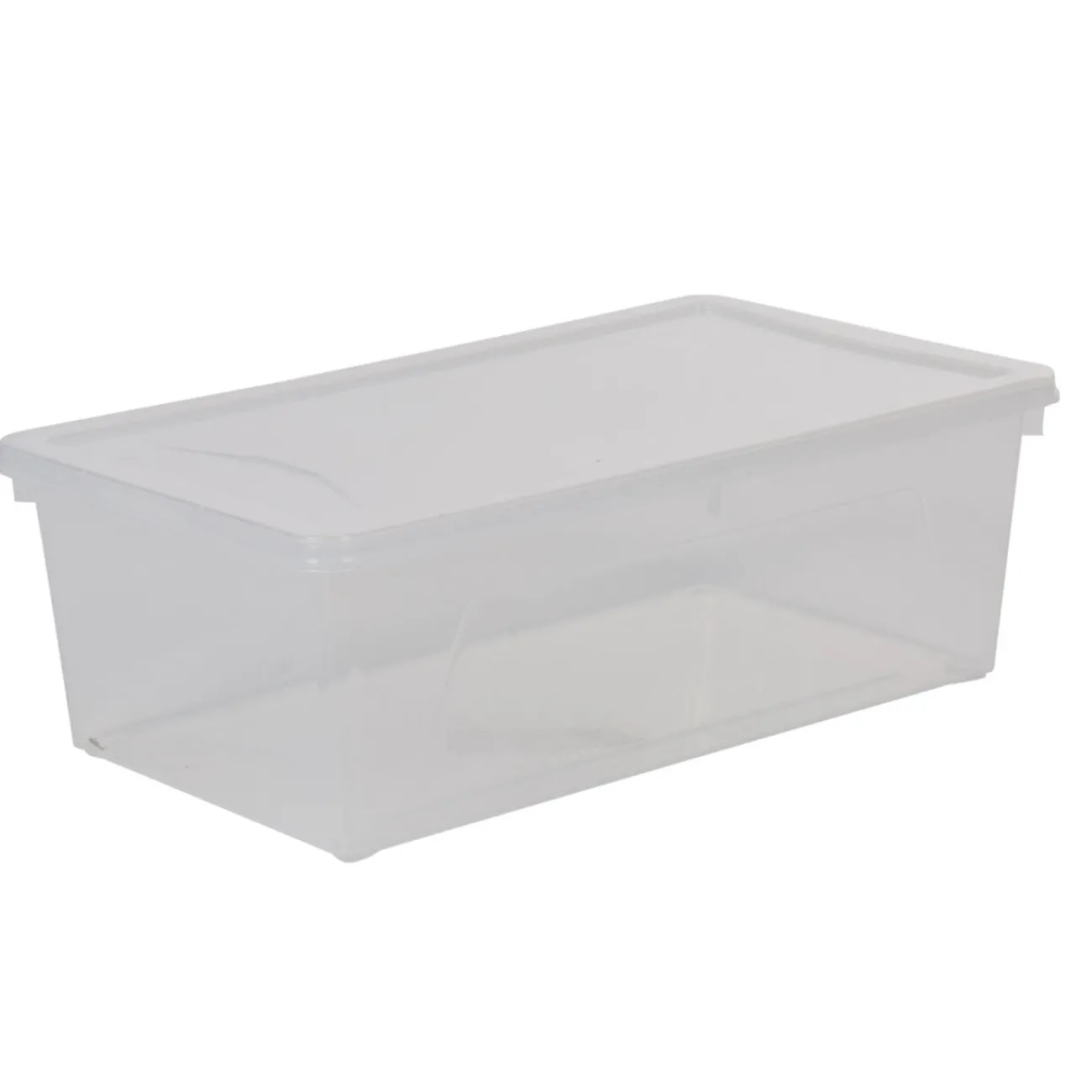Boîte de rangement en plastique transparent avec couvercle pour ranger textile ou petits objets.