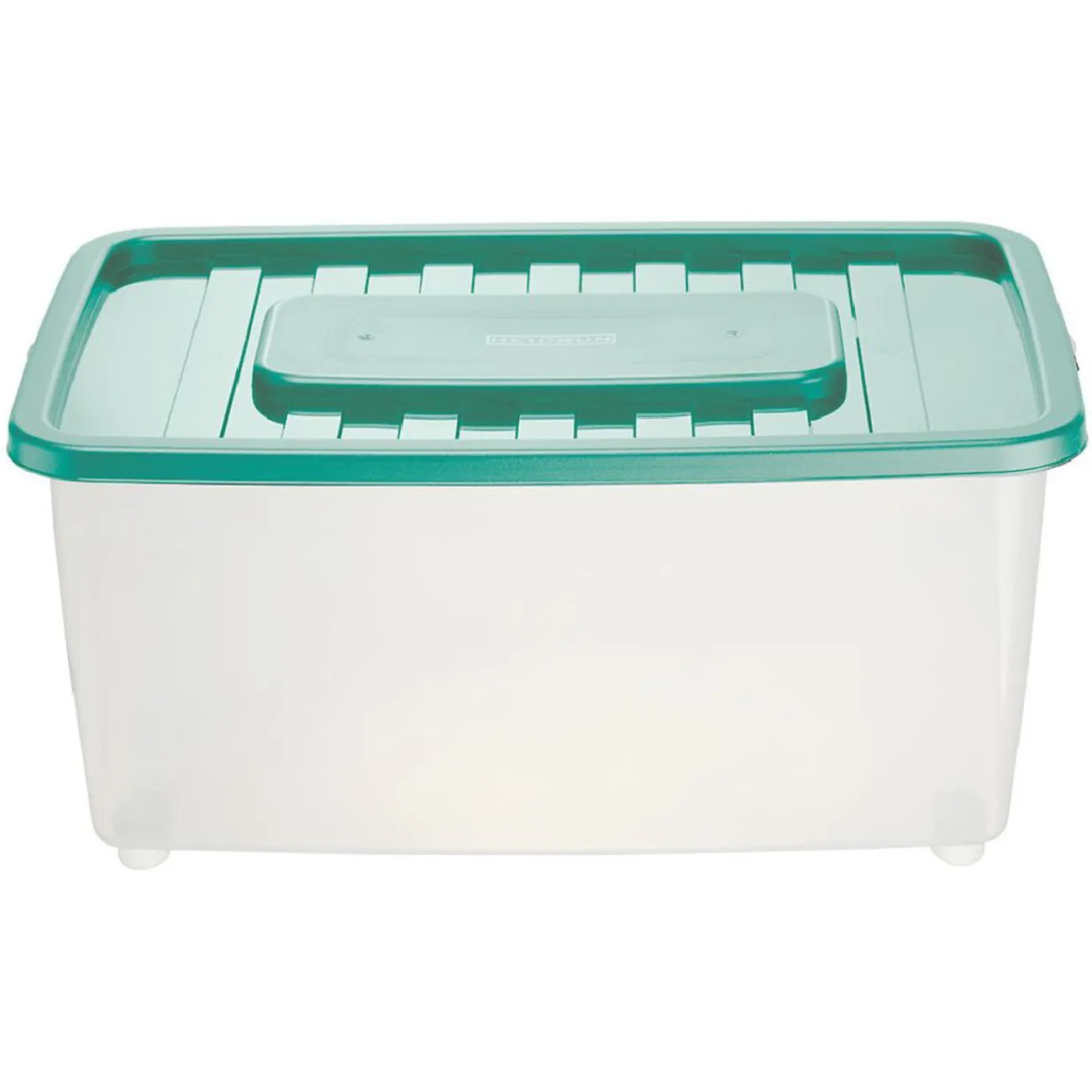Box de rangement en plastique transparent avec couvercle de couleur.