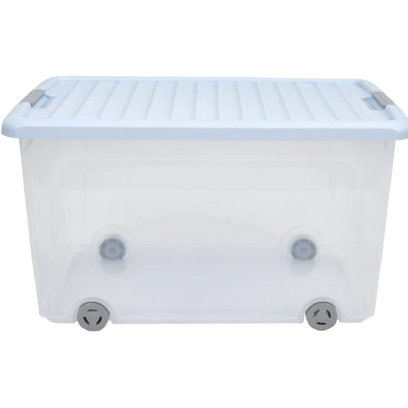Box de rangement à roulettes transparent avec couvercle bleu.