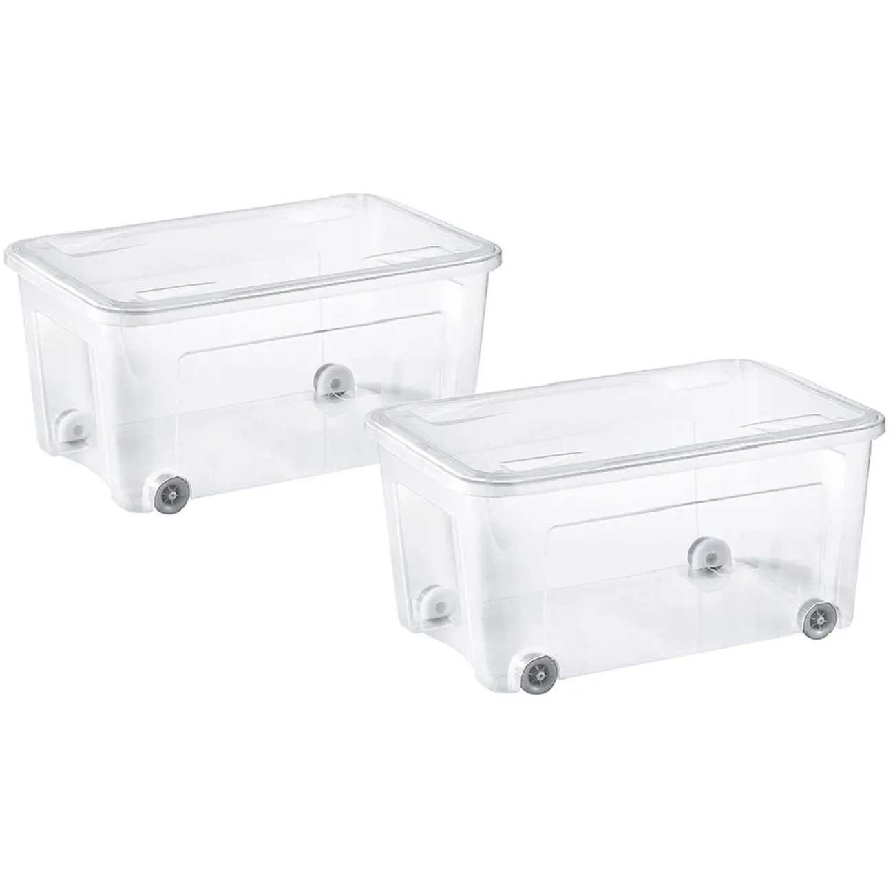 Lot de 2 box de rangement transparents avec clips de fermeture et 4 roulettes pour un déplacement facilité.