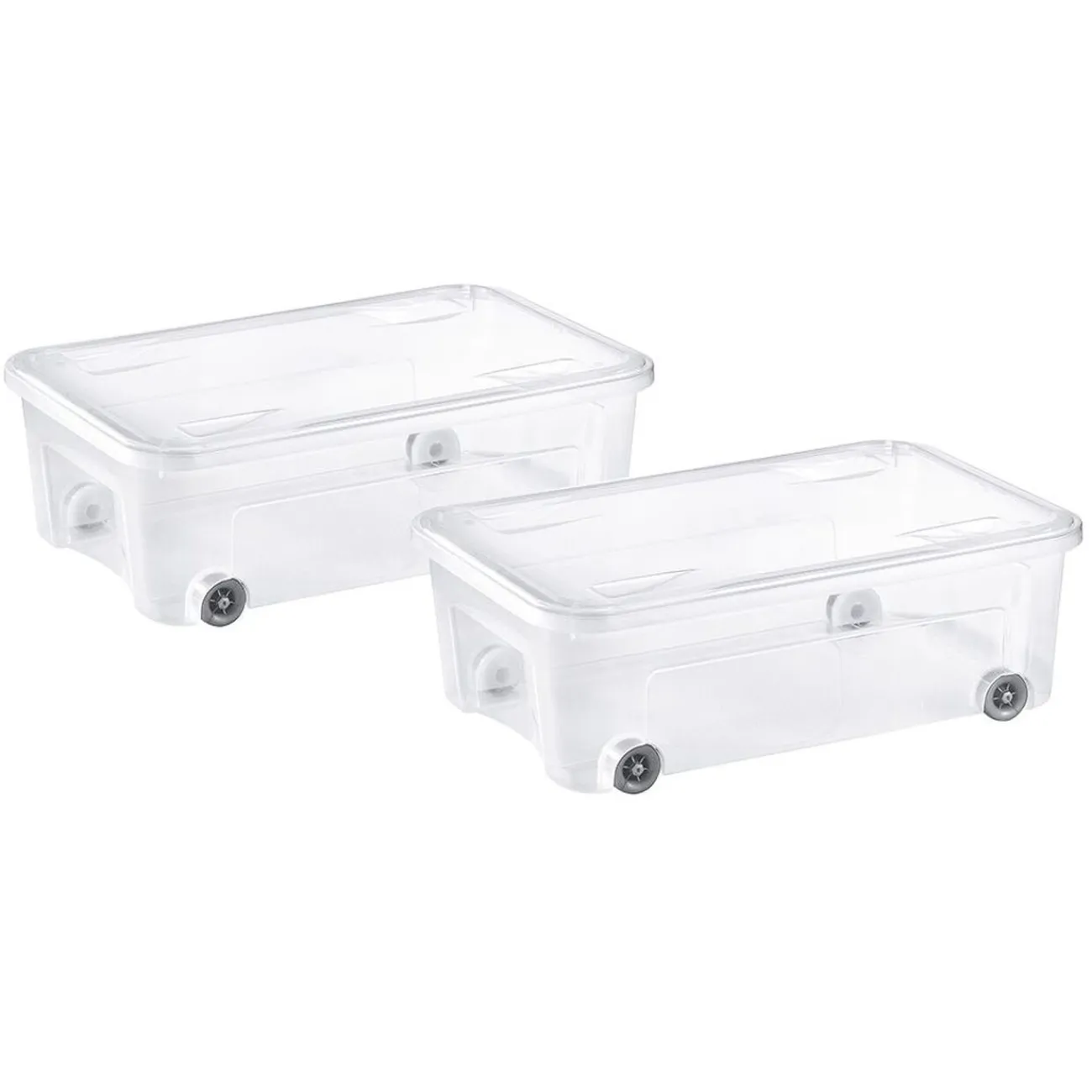 Lot de 2 box de rangement dessous de lit avec clips de fermeture et 4 roulettes pour un déplacement facilité.
