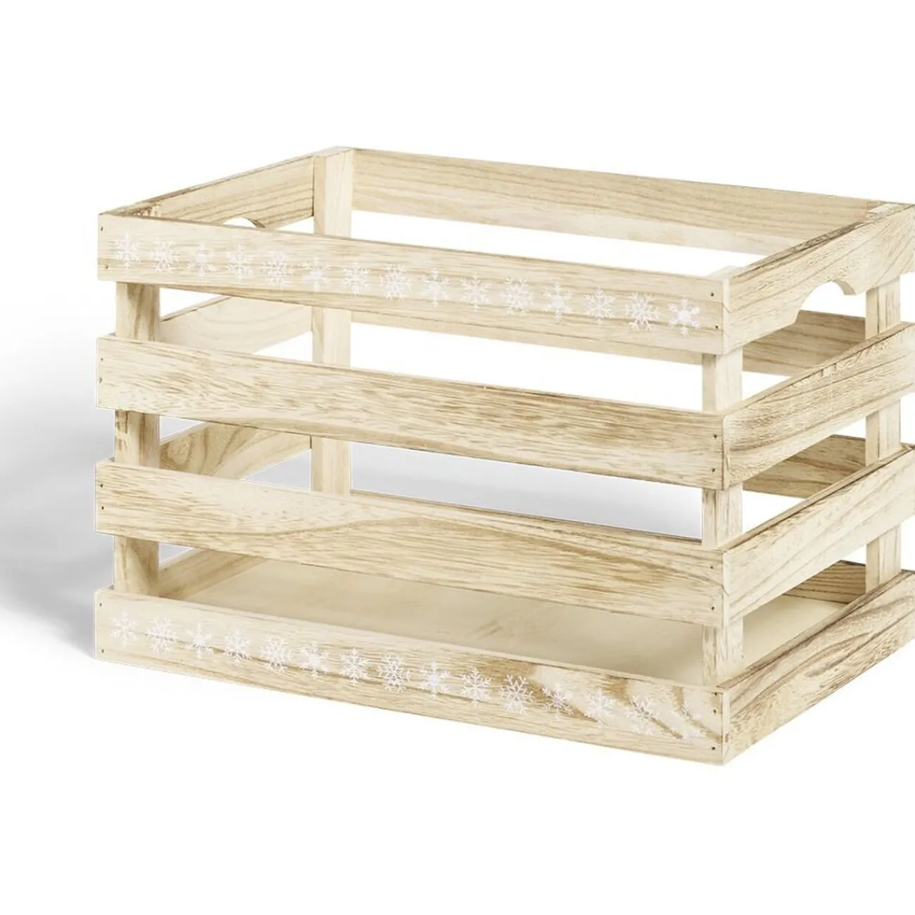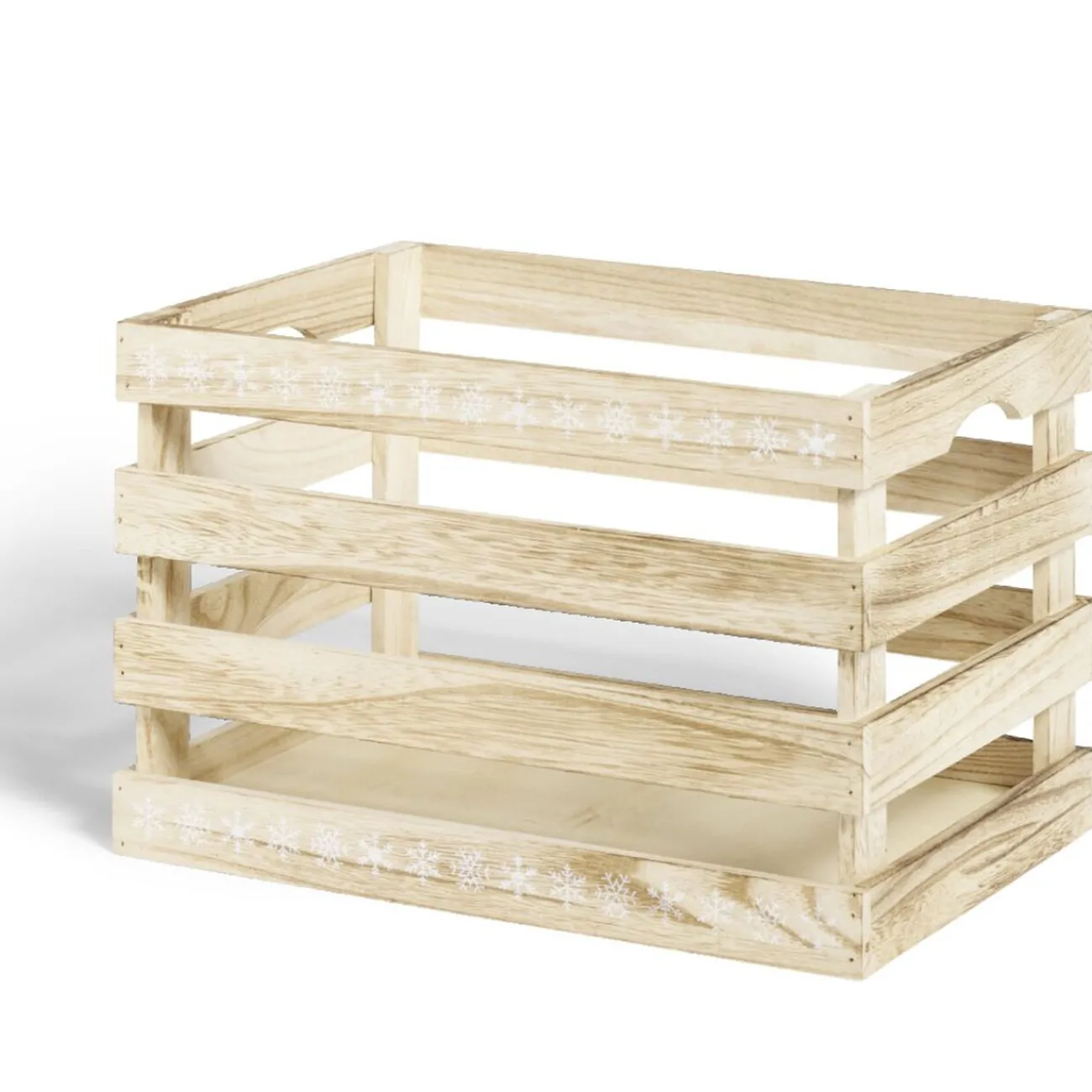Cette caisse de rangement en bois à motifs flocons blancs est idéale pour apporter une touche rustique à votre déco hivernale.