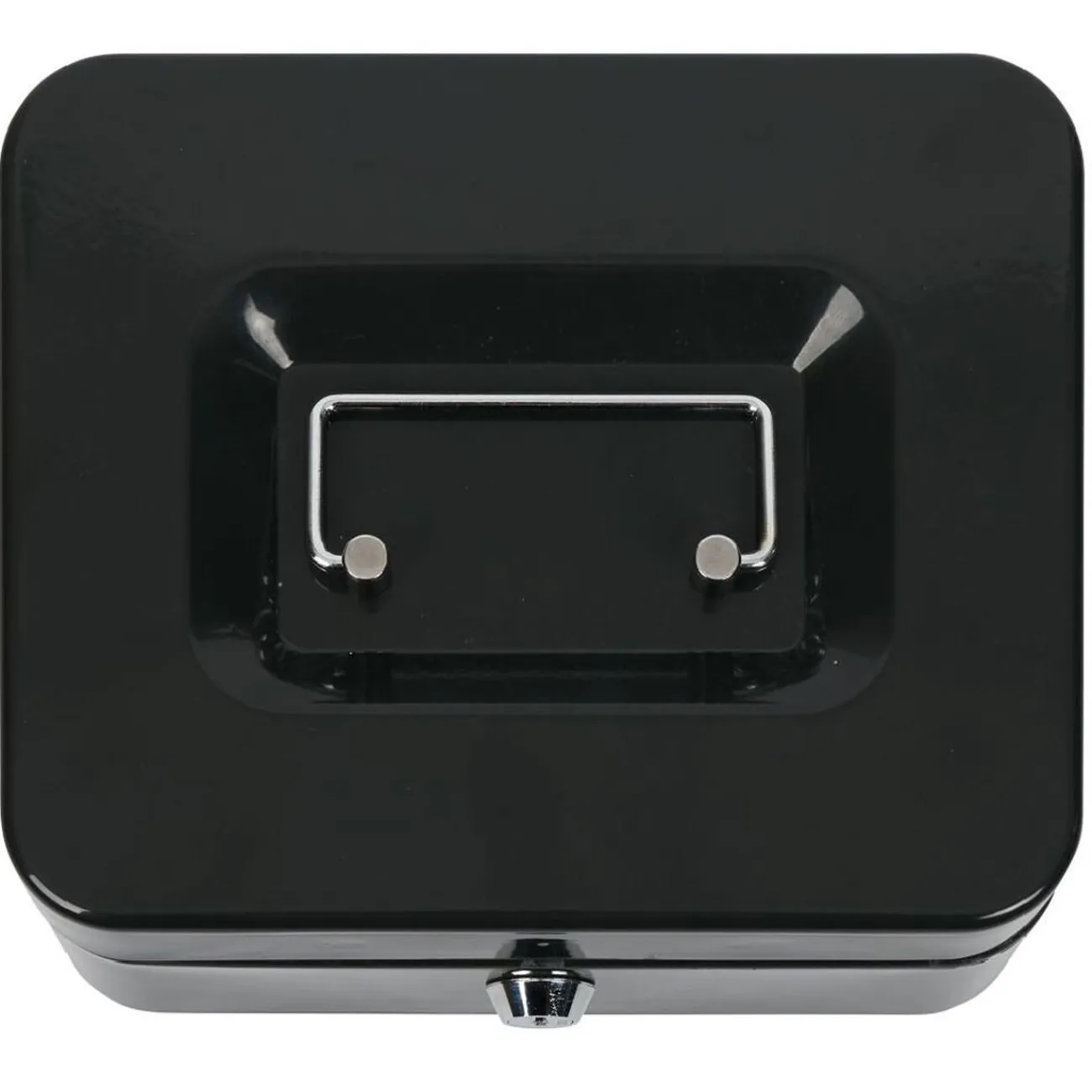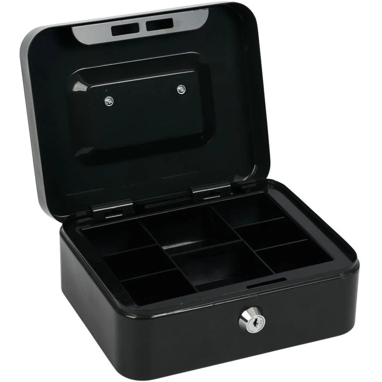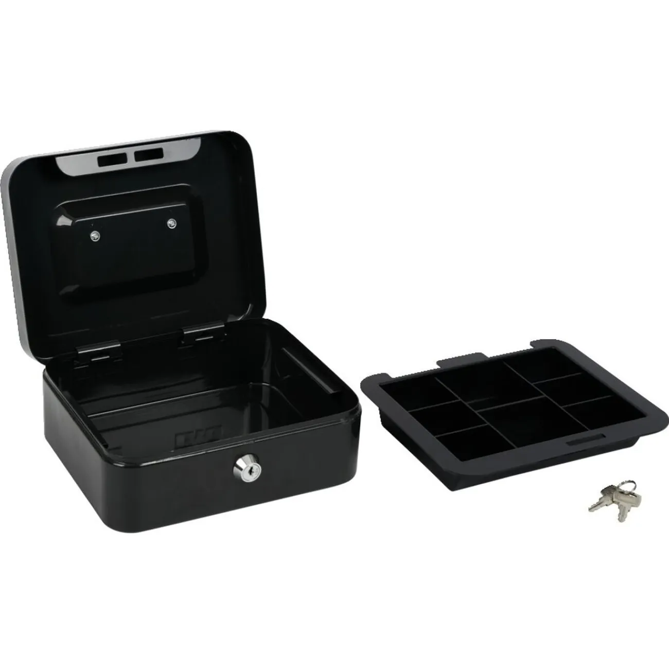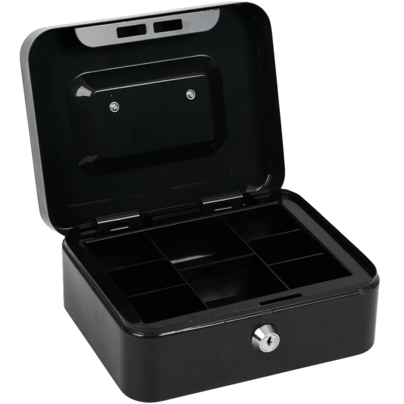 Caisse à monnaie en métal gris foncé, robuste et sécurisée, équipée de deux clés ainsi que d’un plateau à monnaie, offrant une organisation pratique pour la gestion des espèces.