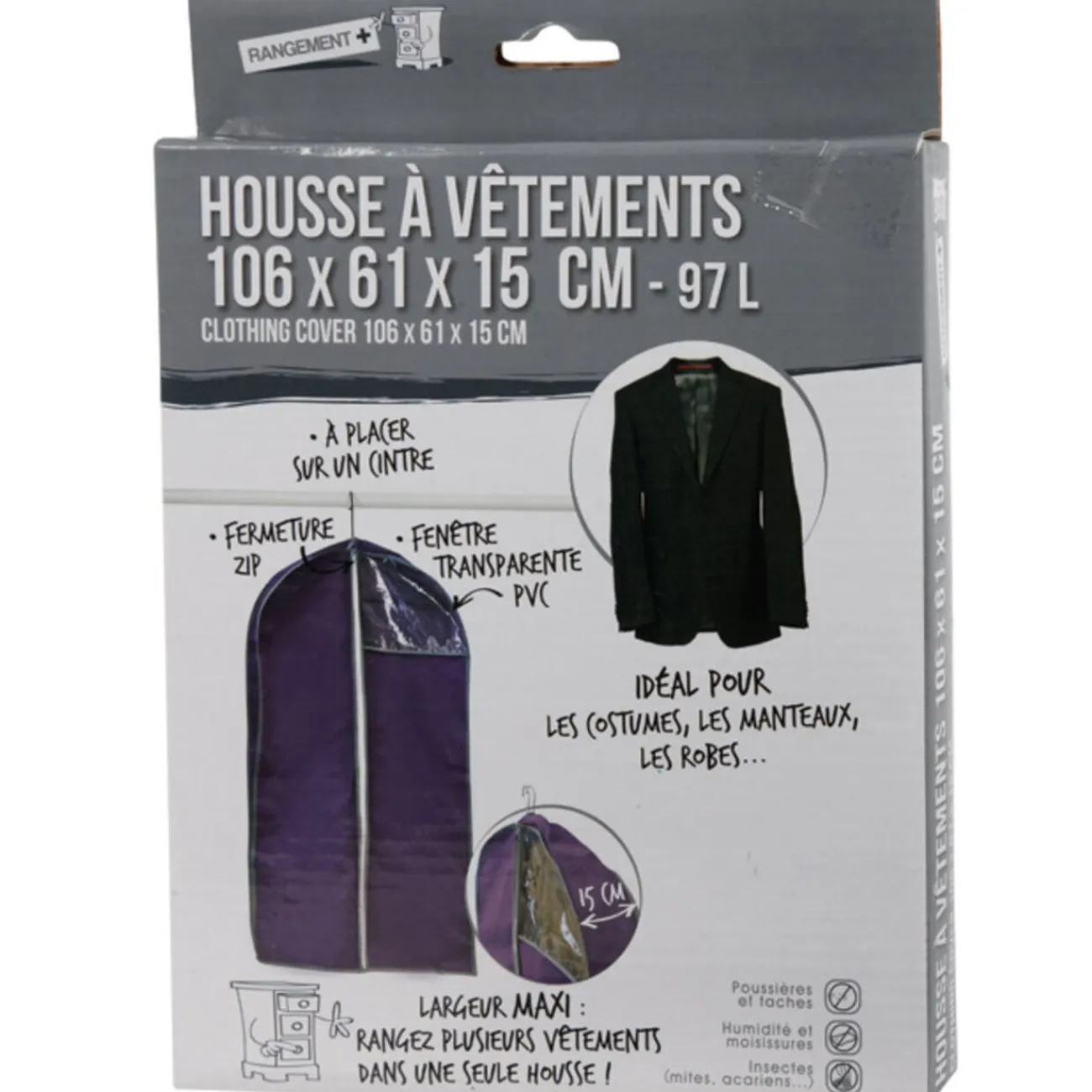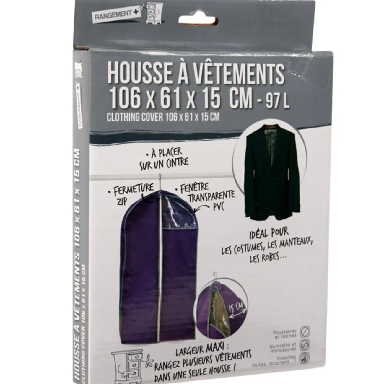Housse à vêtements 97 L, dim. 106x61x15 cm, plastique. Fermeture à glissière, à placer sur un cintre, fenêtre transparente PVC, idéal pour les costumes, les manteaux, les robes… Protège de la poussière, des tâches, de l’humidité, des insectes…