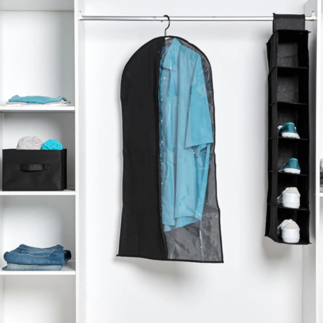 Protégez vos vêtements de la poussière grâce à cette housse de protection à suspendre en tissu non tissé noir.