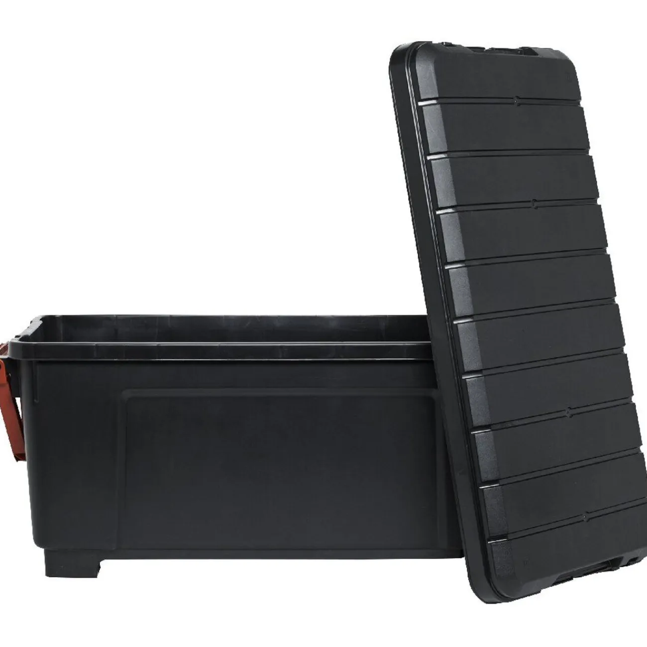 Malle, coffre de rangement, de couleur noir et rouge.