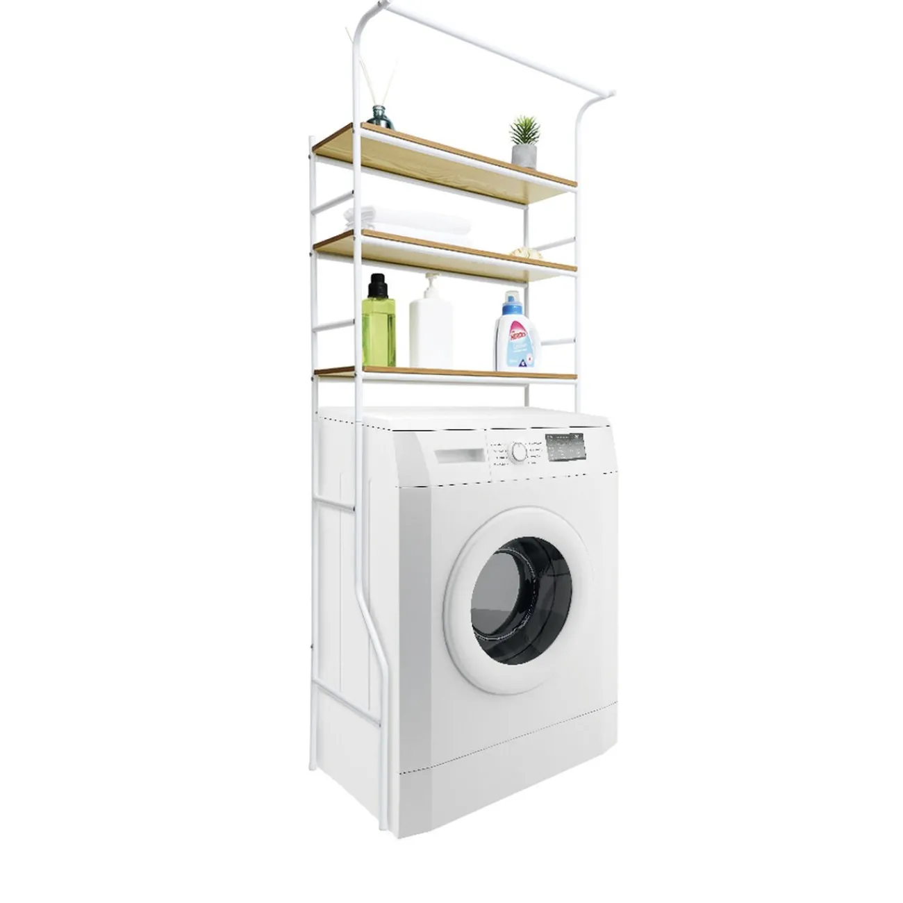 Meuble de buanduerie en métal blanc avec 3 étagères en bois de couleur naturelle. Idéalement placé au dessus d’une machine à laver, vous pourrez y disposer vos produits d’entretien.