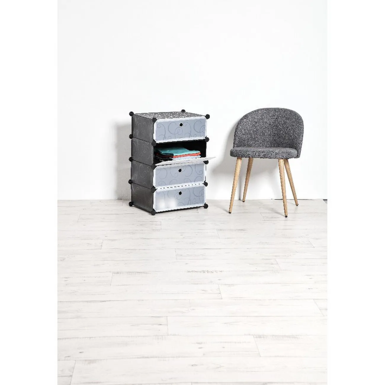 Meuble de rangement noir et blanc avec 4 niveaux modulables et fermeture à rabat pour un accès et un rangement facilité.
