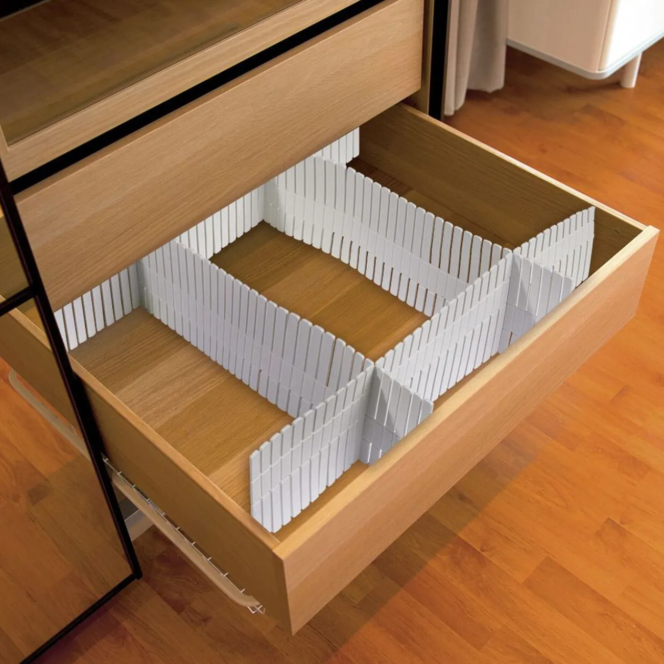 Lot de 4 organisateurs de tiroir découpables à assembler selon vos besoins. Idéal pour retrouver plus facilement vos petits accessoires dans tous les tiroirs de la maison : meuble de salle de bain, commode, armoire, bureau…