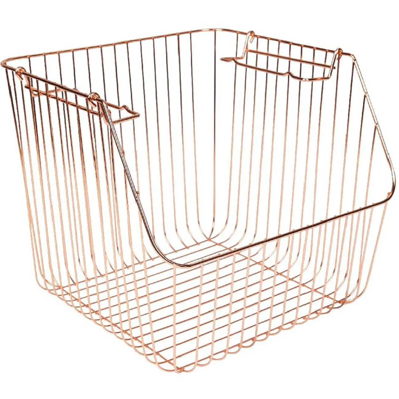Optez pour ce panier au design filaire en métal de couleur cuivre, avec anses et superposable pour un accès direct au contenu.
