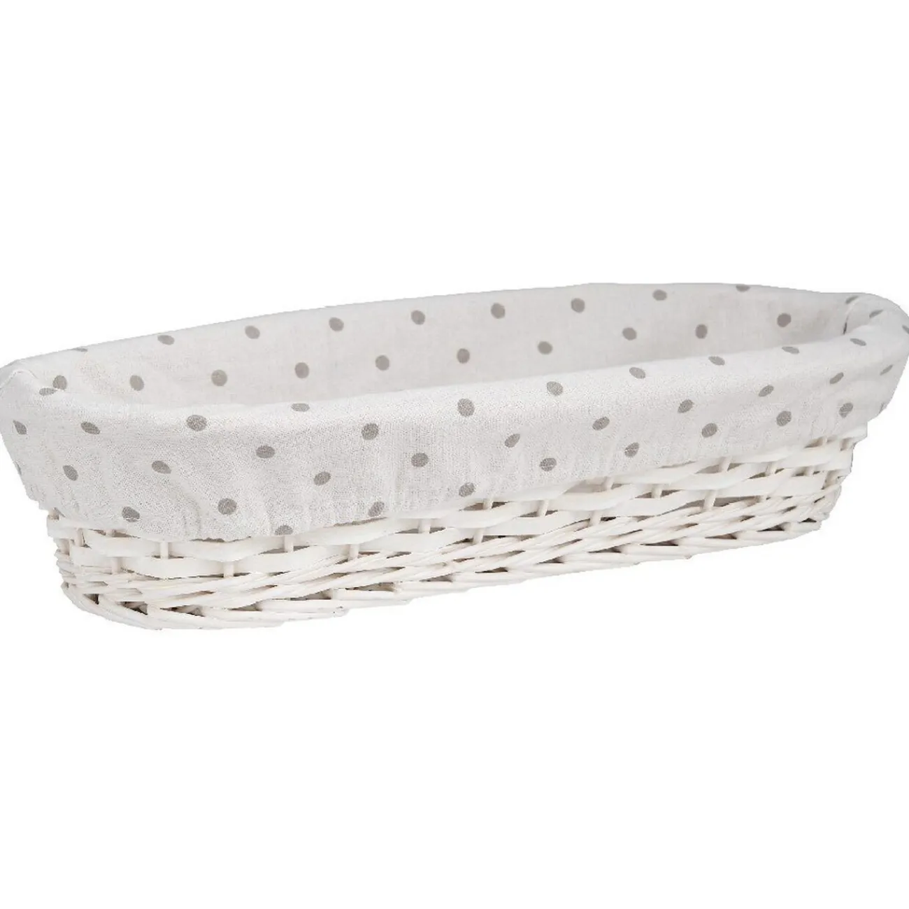 Ce panier ovale blanc en bois tressé est revêtu d’un joli tissu déco blanc à pois gris, idéal pour ranger les petites affaires qui traînent dans la chambre ou la salle de bain.