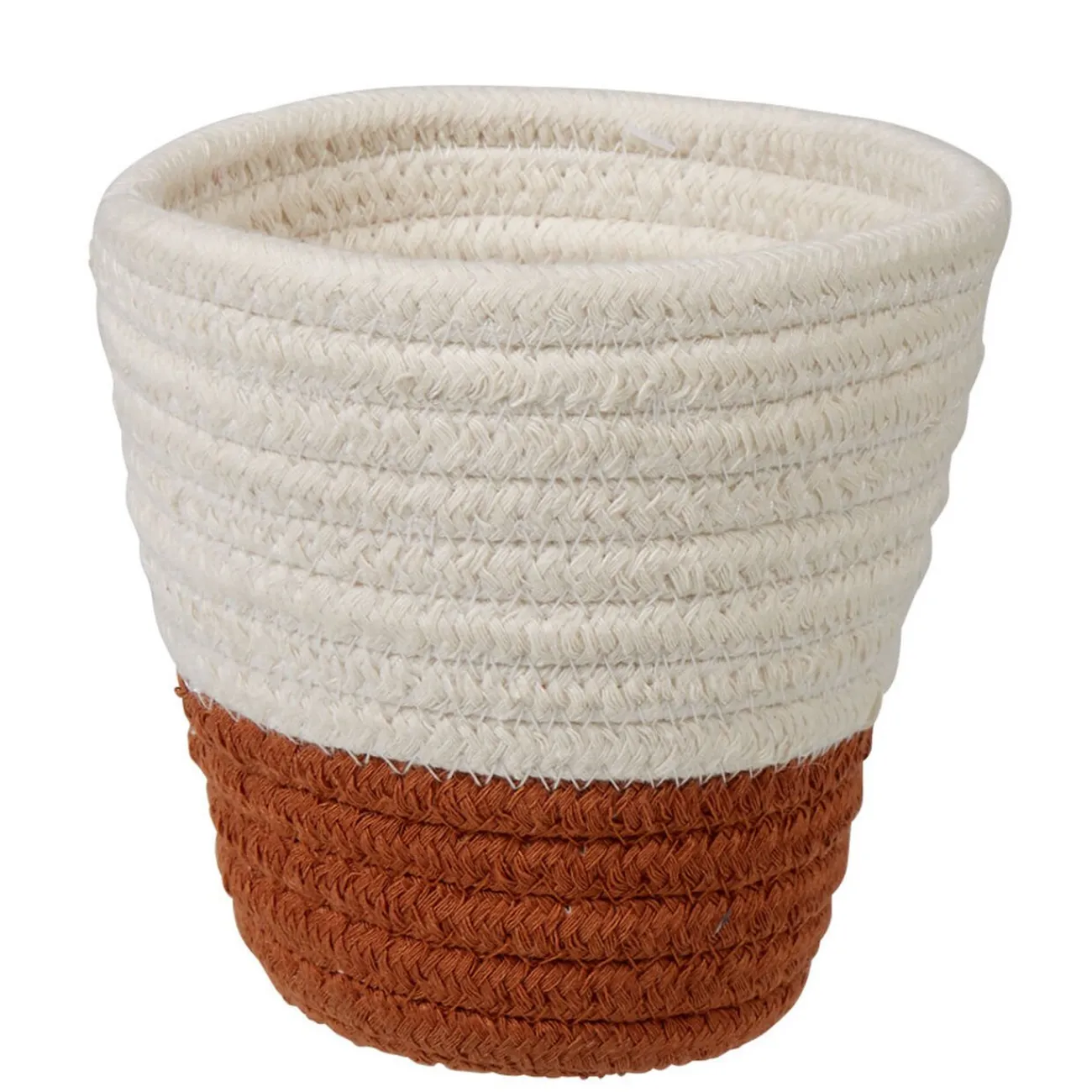 Panier rond en coton bicolore blanc et orange, idéal pour le rangement et la décoration de votre salle de bain dans un esprit bohème.