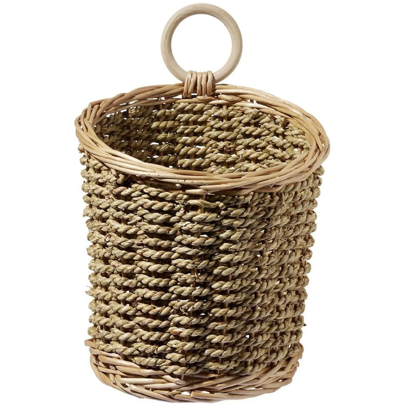 Panière à suspendre en osier marron. Décorative aussi bien avec des fleurs séchées que comme accessoire de rangement dans la cuisine ou la salle de bain.