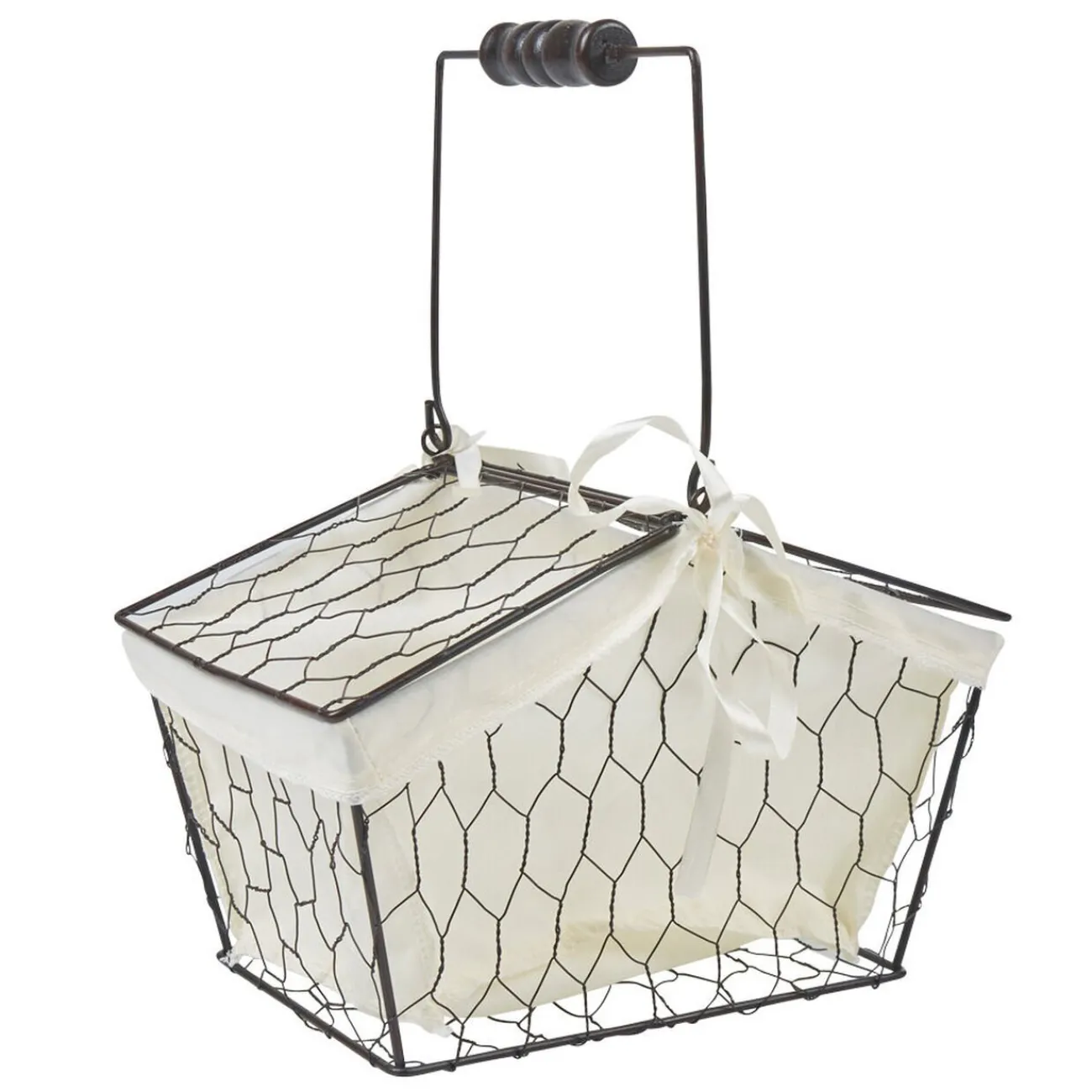 Panière en métal marron avec anse, tissu à l’intérieur, dim. 26x18x18 cm.