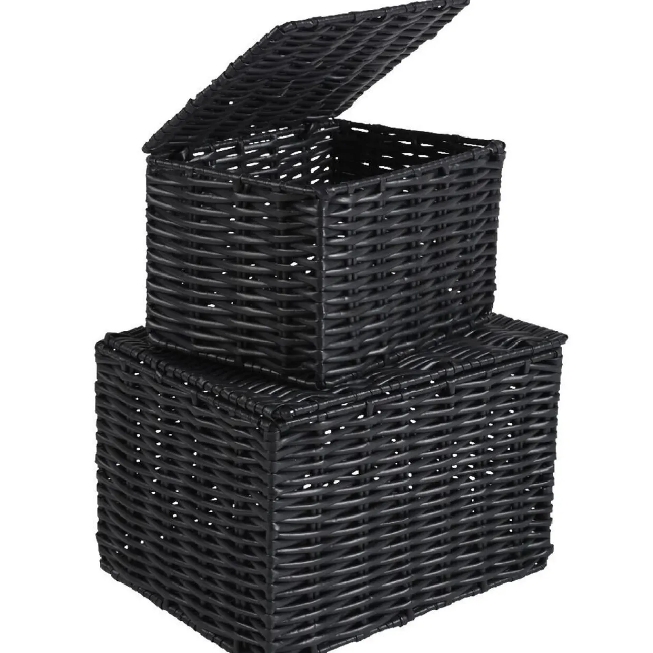 2 panières noires avec couvercle, dim. 16x12x10 cm et 20x16x13 cm, plastique.