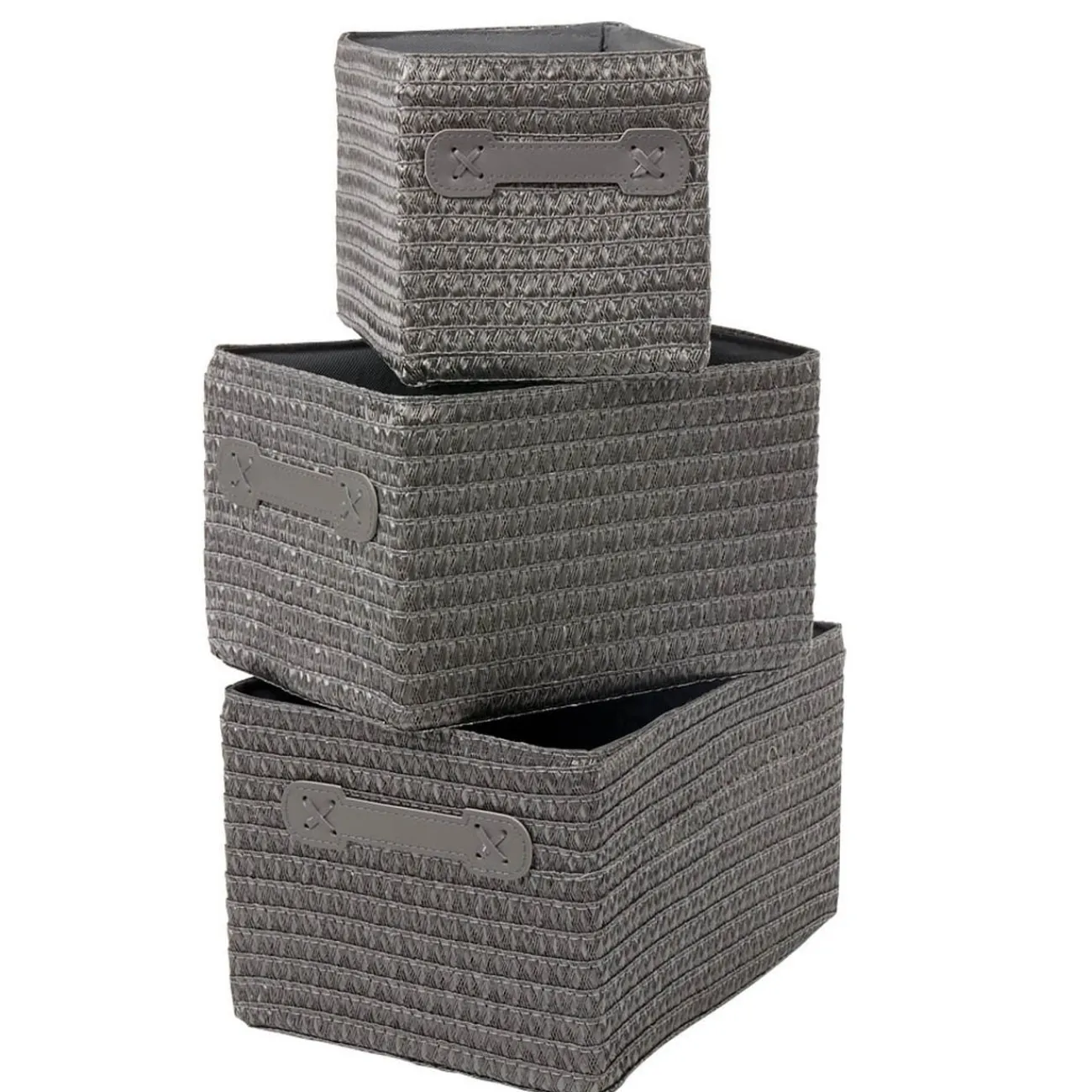 Set de 3 panières grises en plastique effet tressé et décorées de poignées.