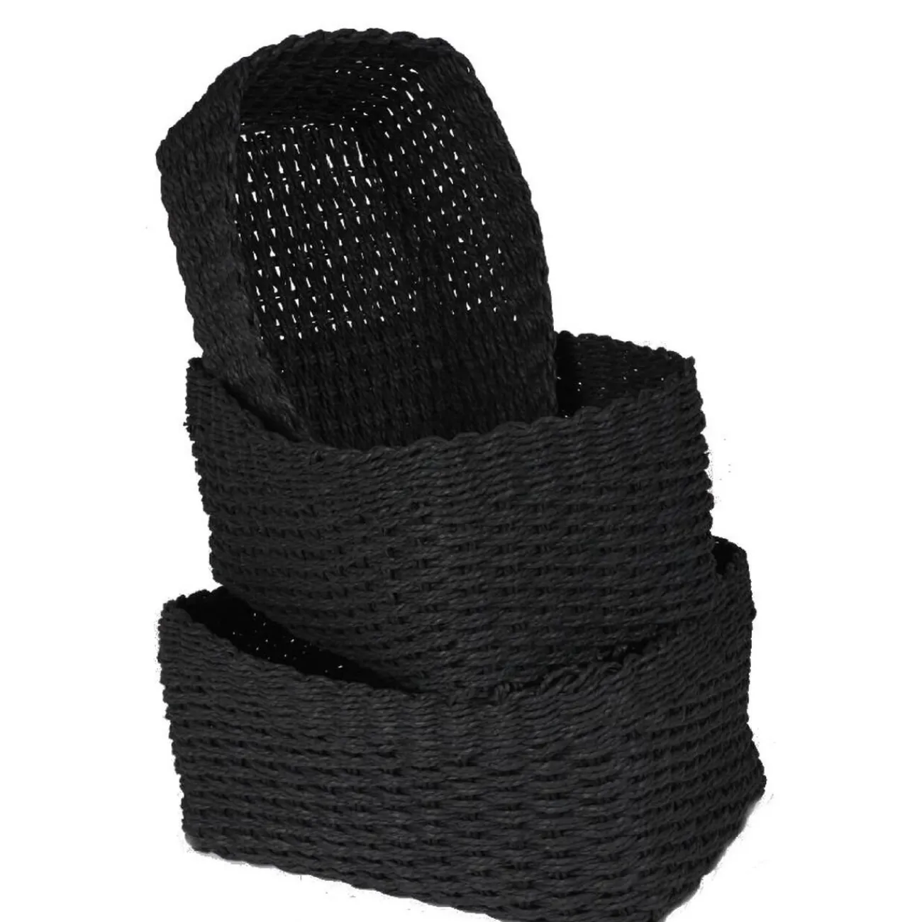 3 panières noires en corde de papier tressé, dim. 16x12x10 cm, 20x16x13 cm et 35x25x18 cm.