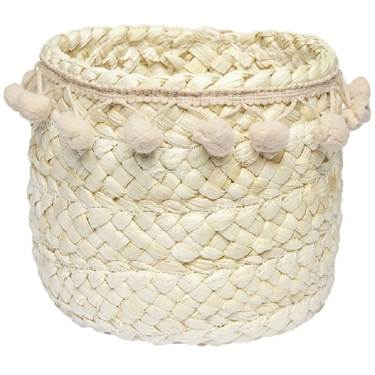 Ajoutez une touche bohême à votre rangement avec cette jolie panière en jonc naturel décorée de pompons roses. Pratique pour organiser avec style vos petites affaires et accessoires quotidien.
