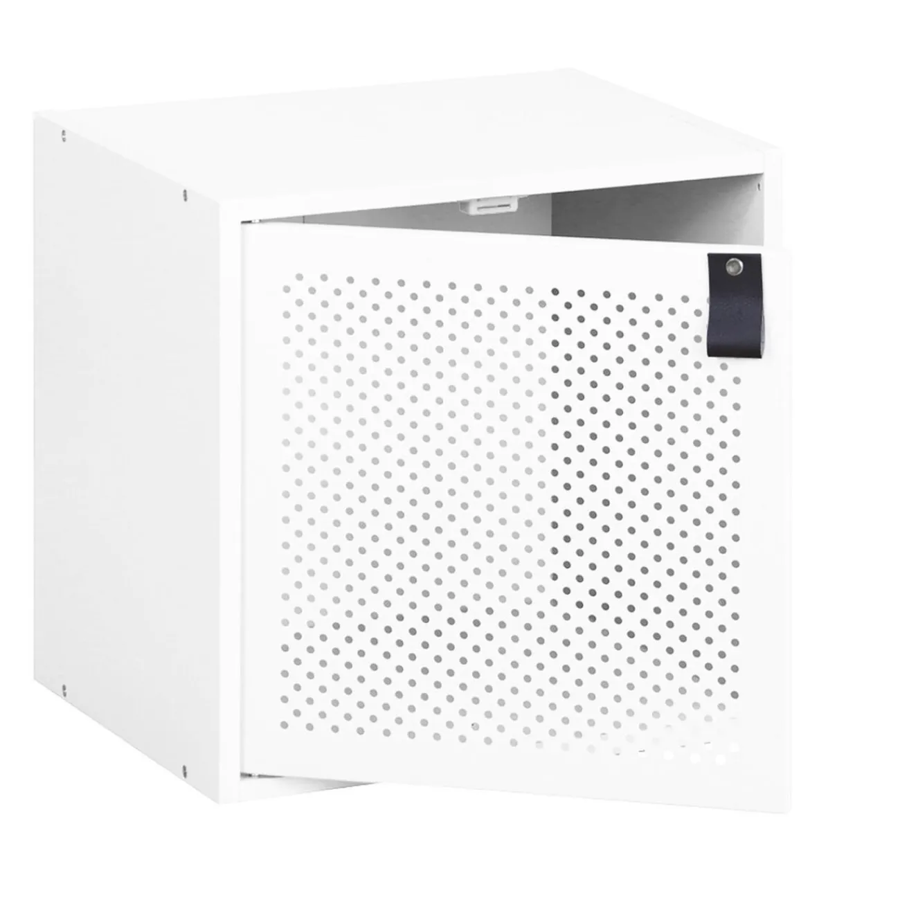 Il est possible de fermer vos étagères pour un côté plus intime, en fixant cette porte en métal ajouré blanc sur une ou plusieurs de vos cases.
