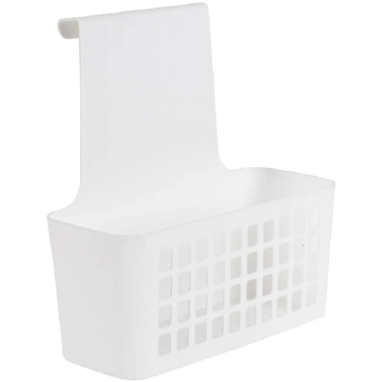 Rangement en plastique ajouré blanc. A accrocher sur la face intérieure ou extérieure d’une porte de placard, armoire de cuisine ou de salle de bain.