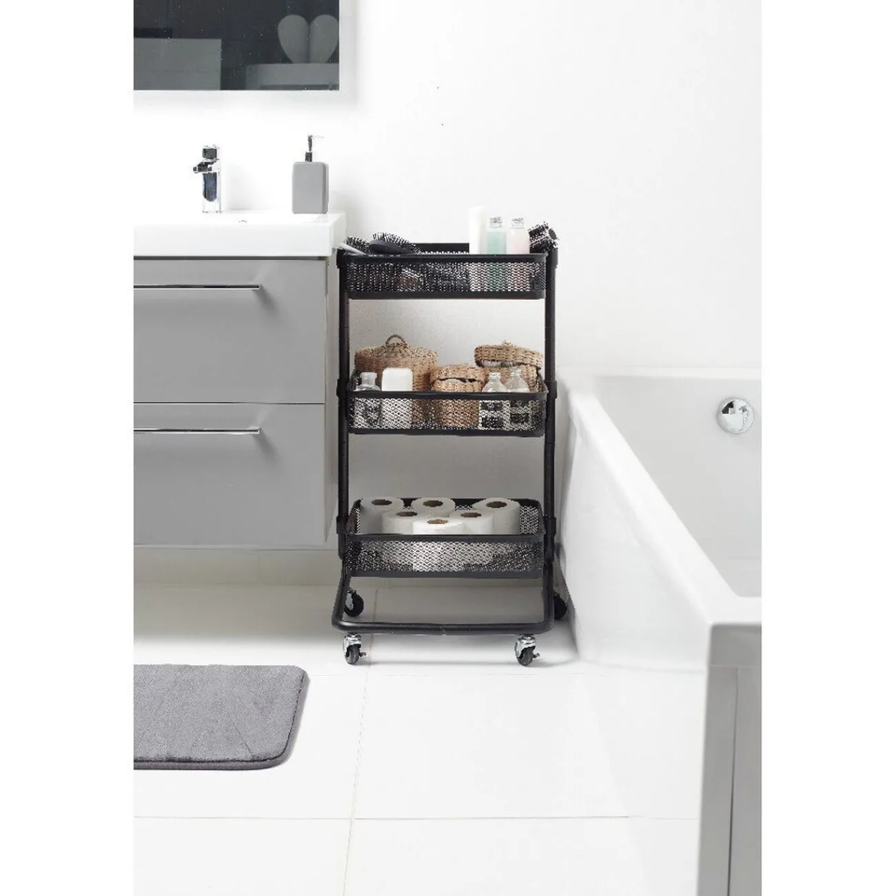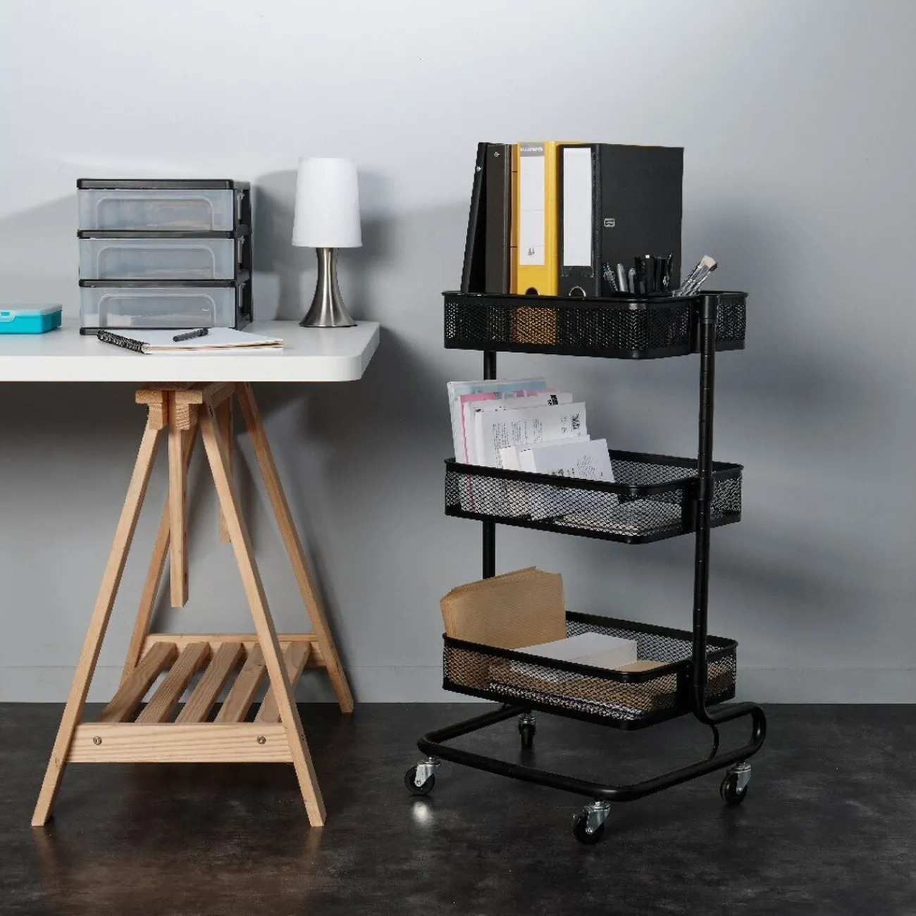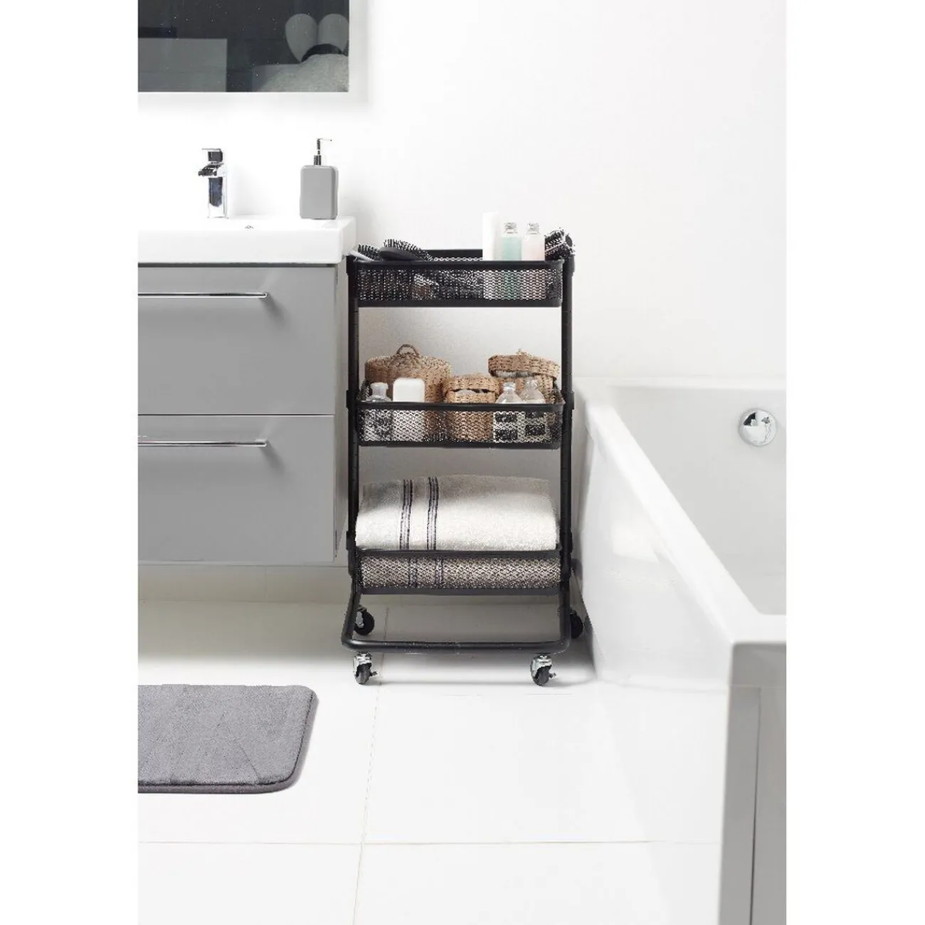 Organisez votre cuisine avec ce resserre légumes noir à roulettes. Pratique et peu encombrant, il se déplace facilement d’un bout à l’autre de la cuisine et trouvera forcément un coin pour être rangé. 4 roulettes et 3 étages pour ranger légumes, épices, huiles et autres condiments.
