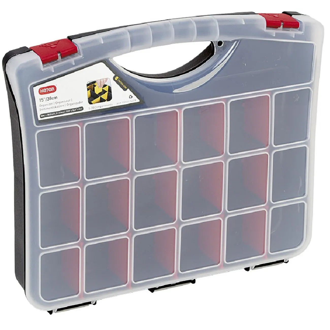 Valisette brico avec fermeture clips et munie de 18 compartiments.