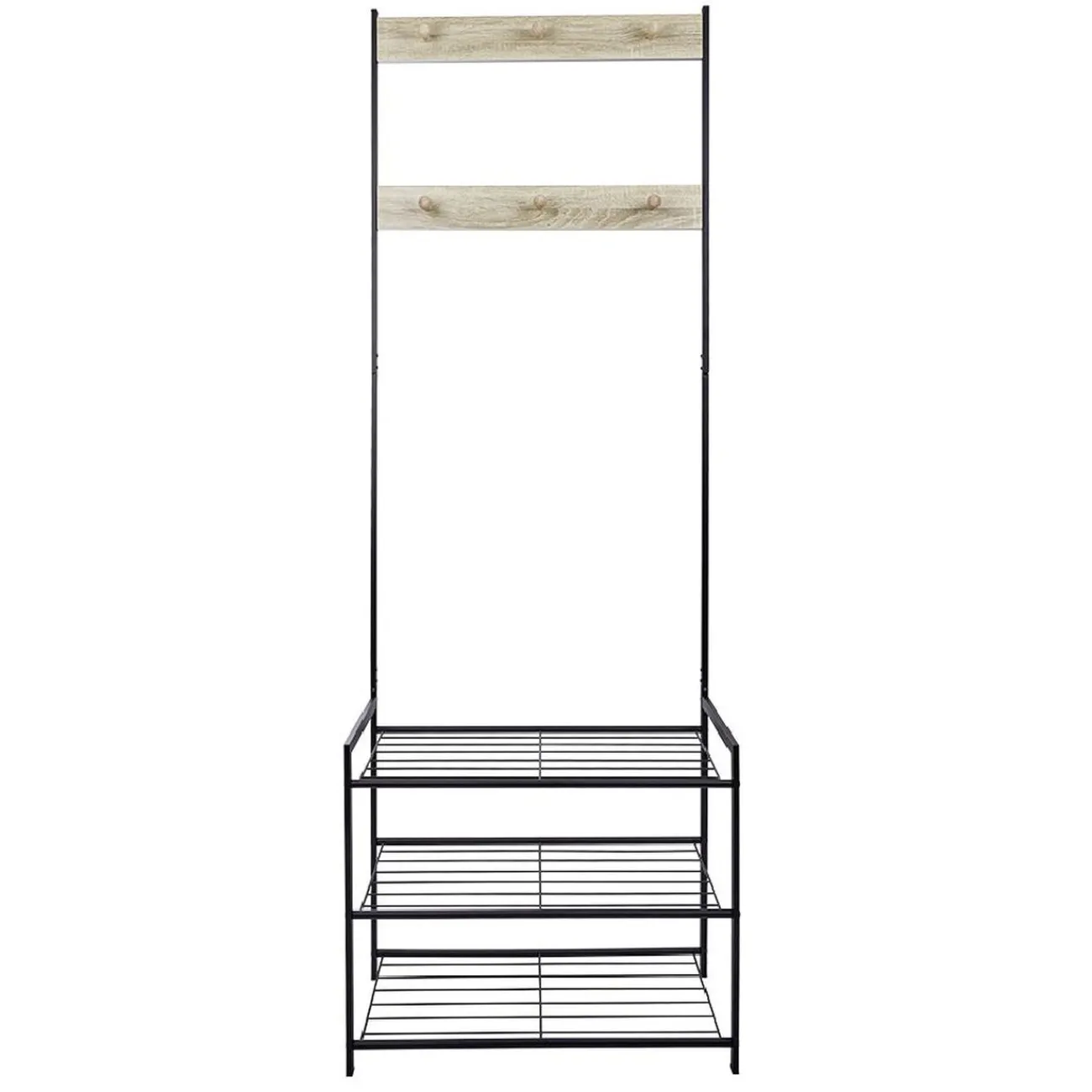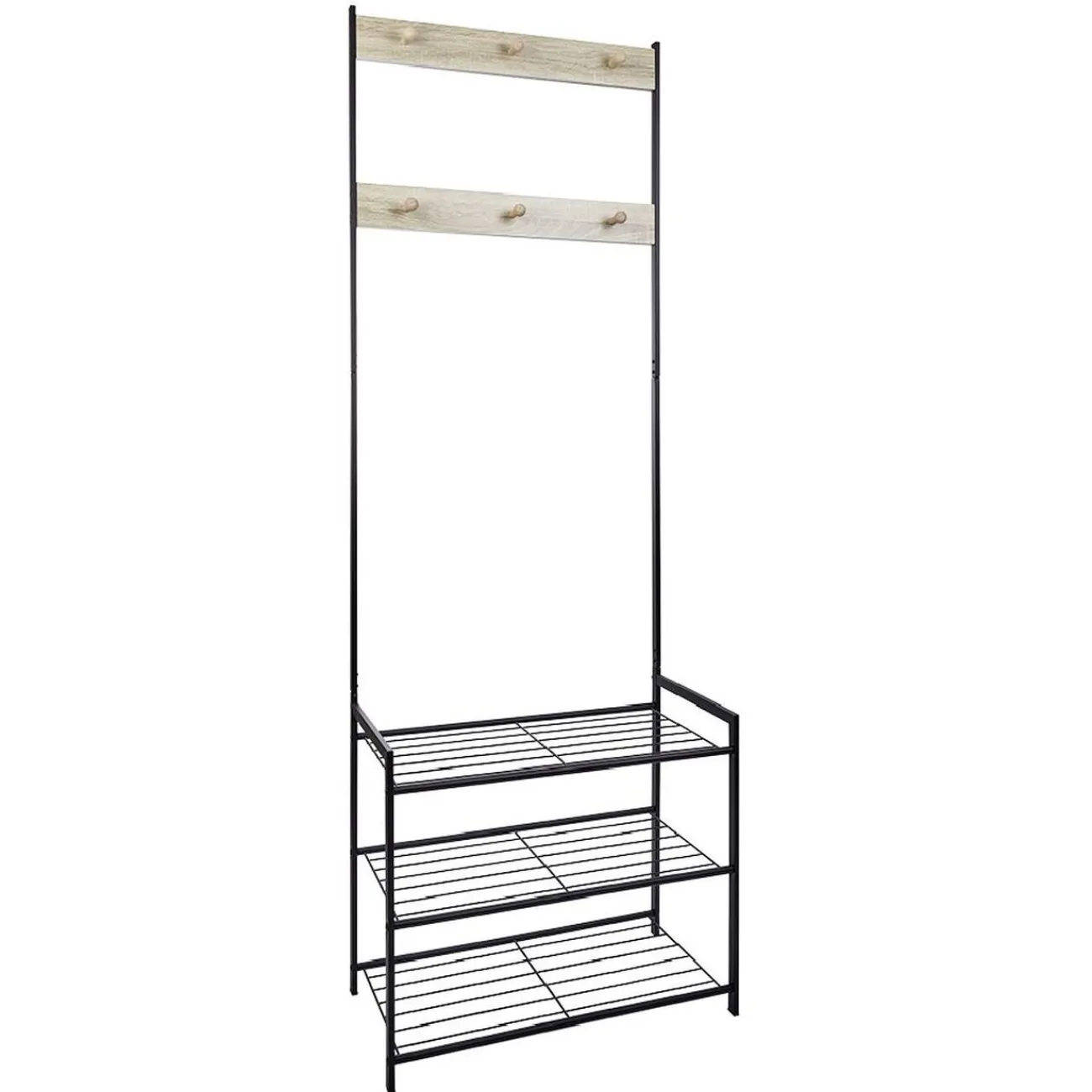 Optez pour ce meuble d’entrée déco et peu encombrant! Il est équipé de deux patères en bois avec 3 crochets chacune et de 3 étagères en métal noir pour les chaussures, sacs et autres accessoires.