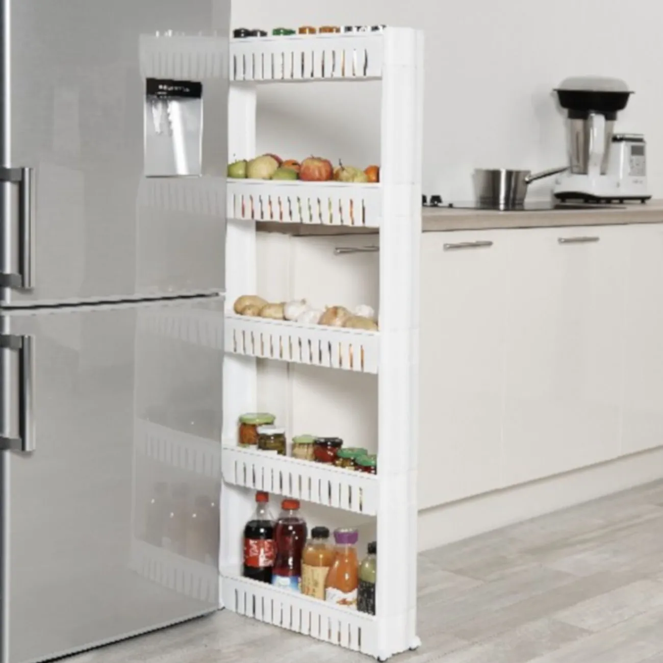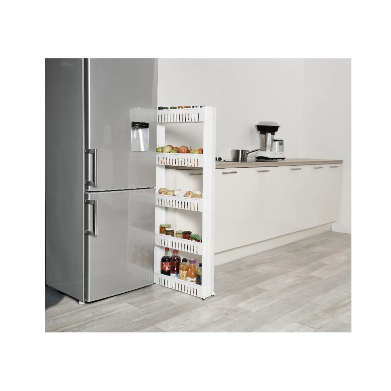 Vous avez de la place entre le frigo et le plan de travail ? Alors gagnez en rangement avec ce resserre légumes de 5 niveaux à roulettes ! Accédez facilement à tous vos condiments avec cette desserte de cuisine où vous pourrez ranger huiles, vinaigres, épices, pomme de terre et herbes fraîches.