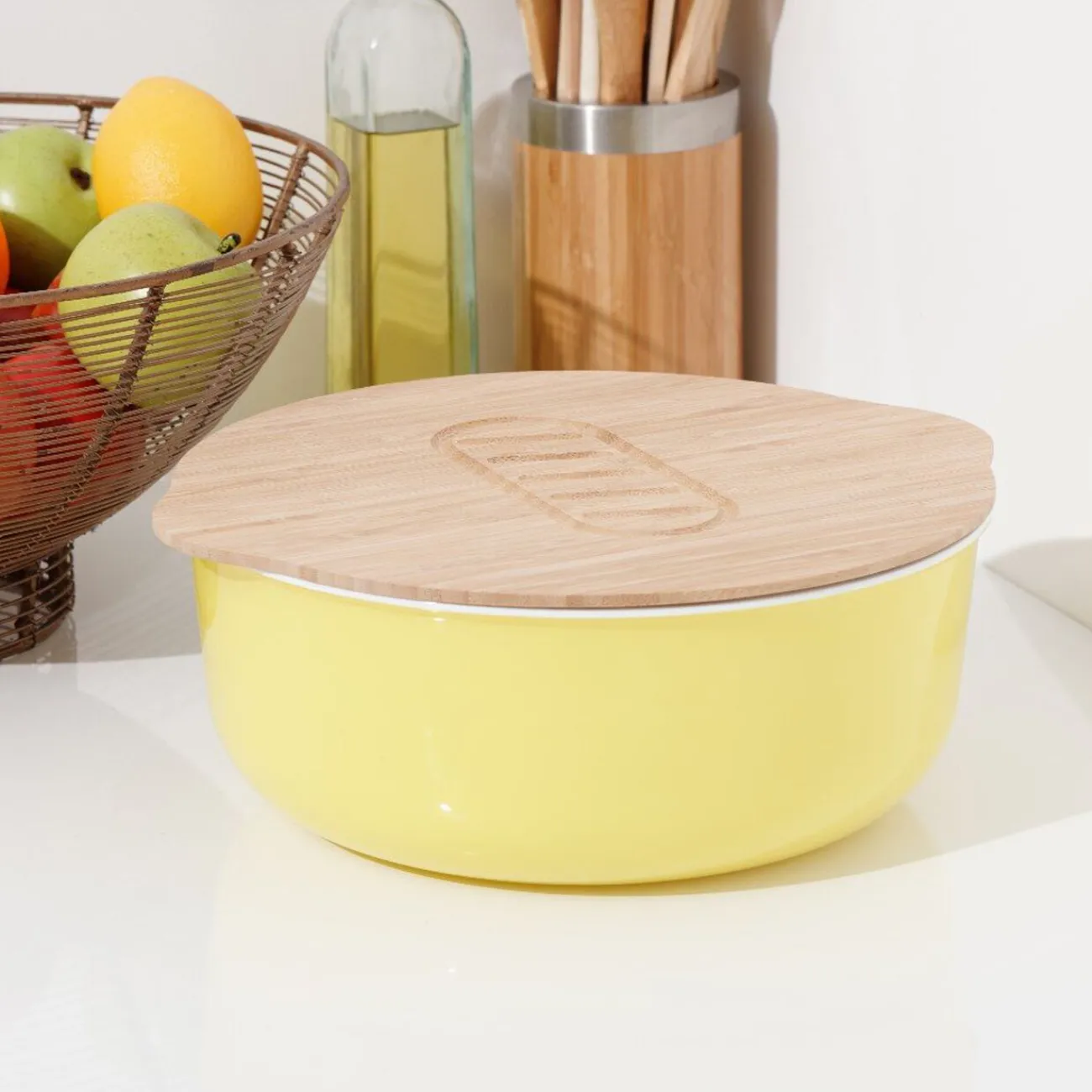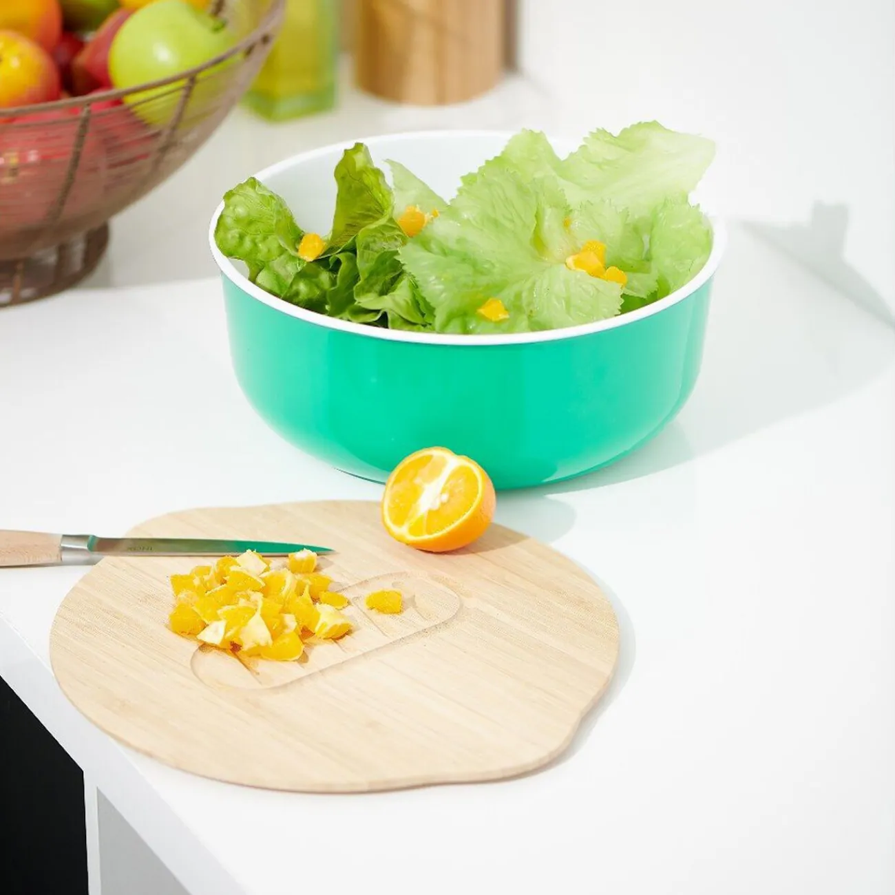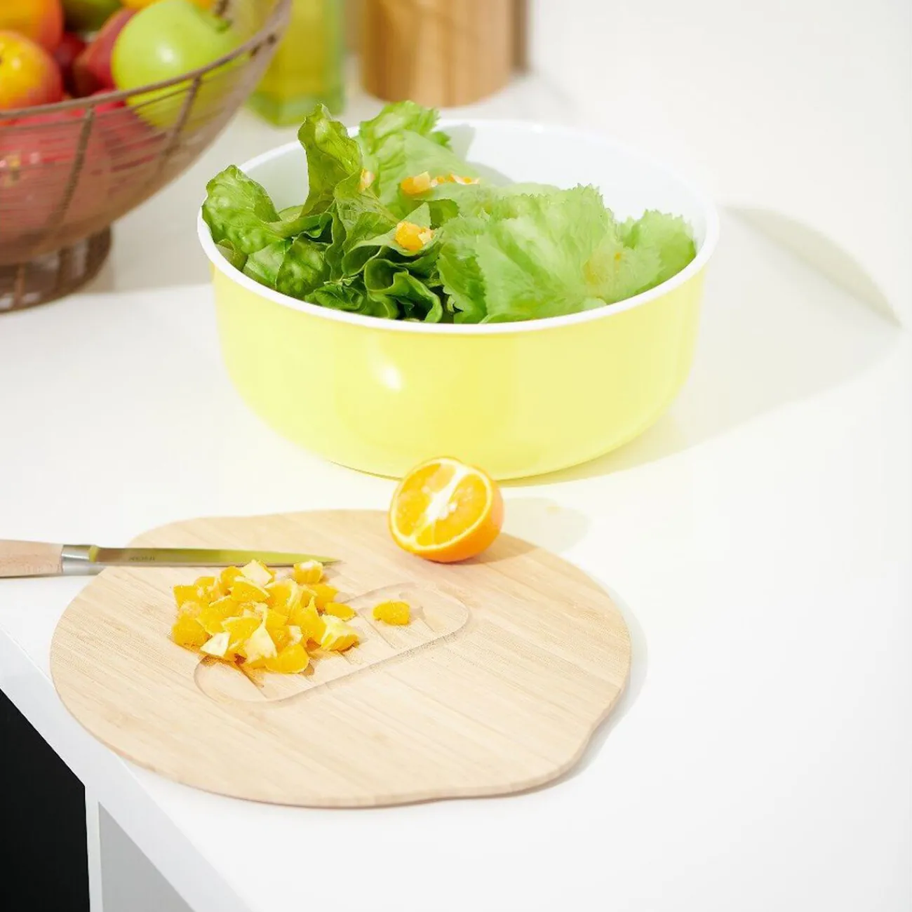 Saladier + couvercle 2 en 1 – Couvercle fonction planche à découper – Existe en 2 coloris : jaune et vert – Dimensions :L31,5x29x12cm – Matière : bambou