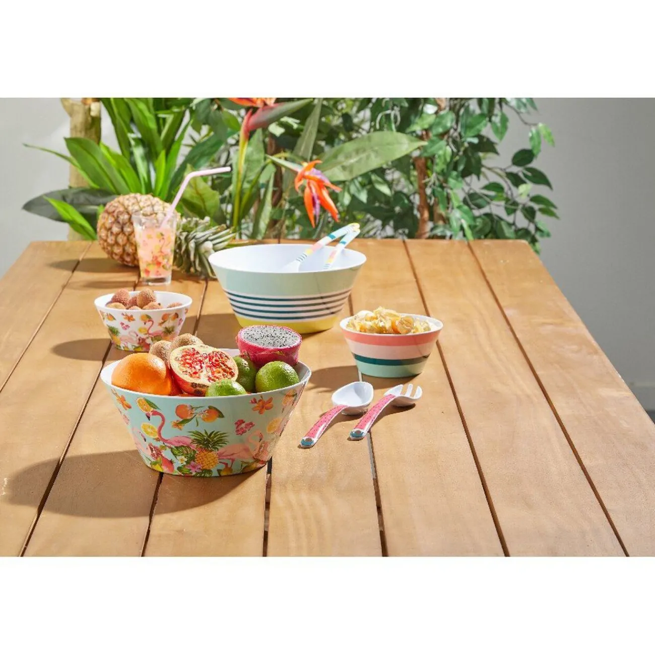 Saladier en mélaminé avec motif bayadère rayures dans les tons bleu jaune et vert. Collection Caraïbes
