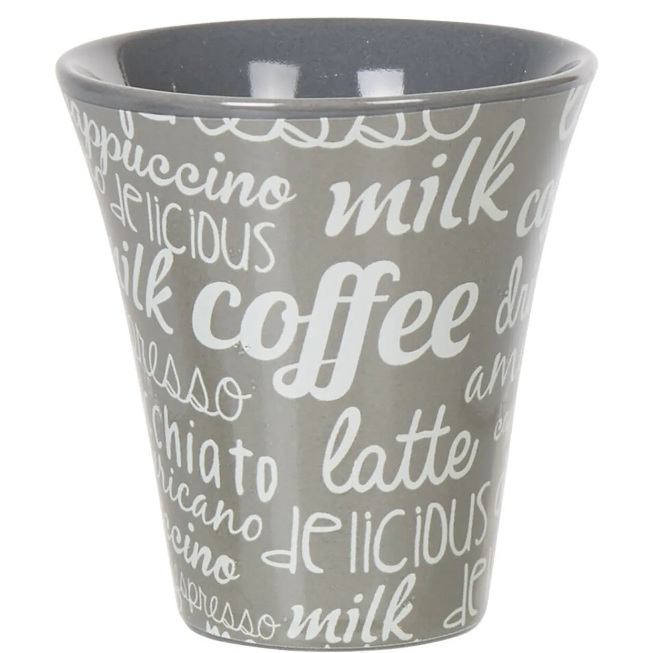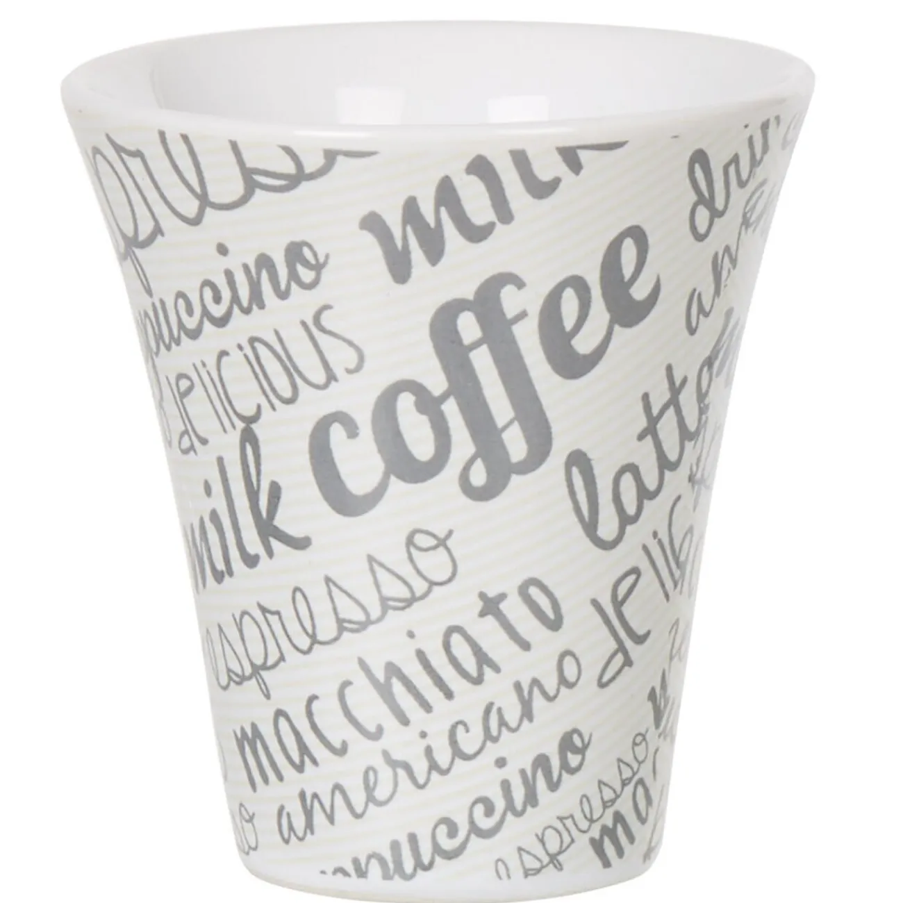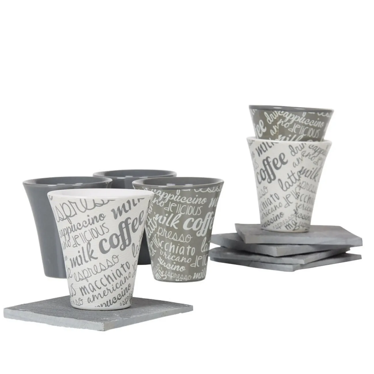 Service à café composé de 6 sous-tasses en ardoise et 6 tasses en faïence multicolore gris blanc.